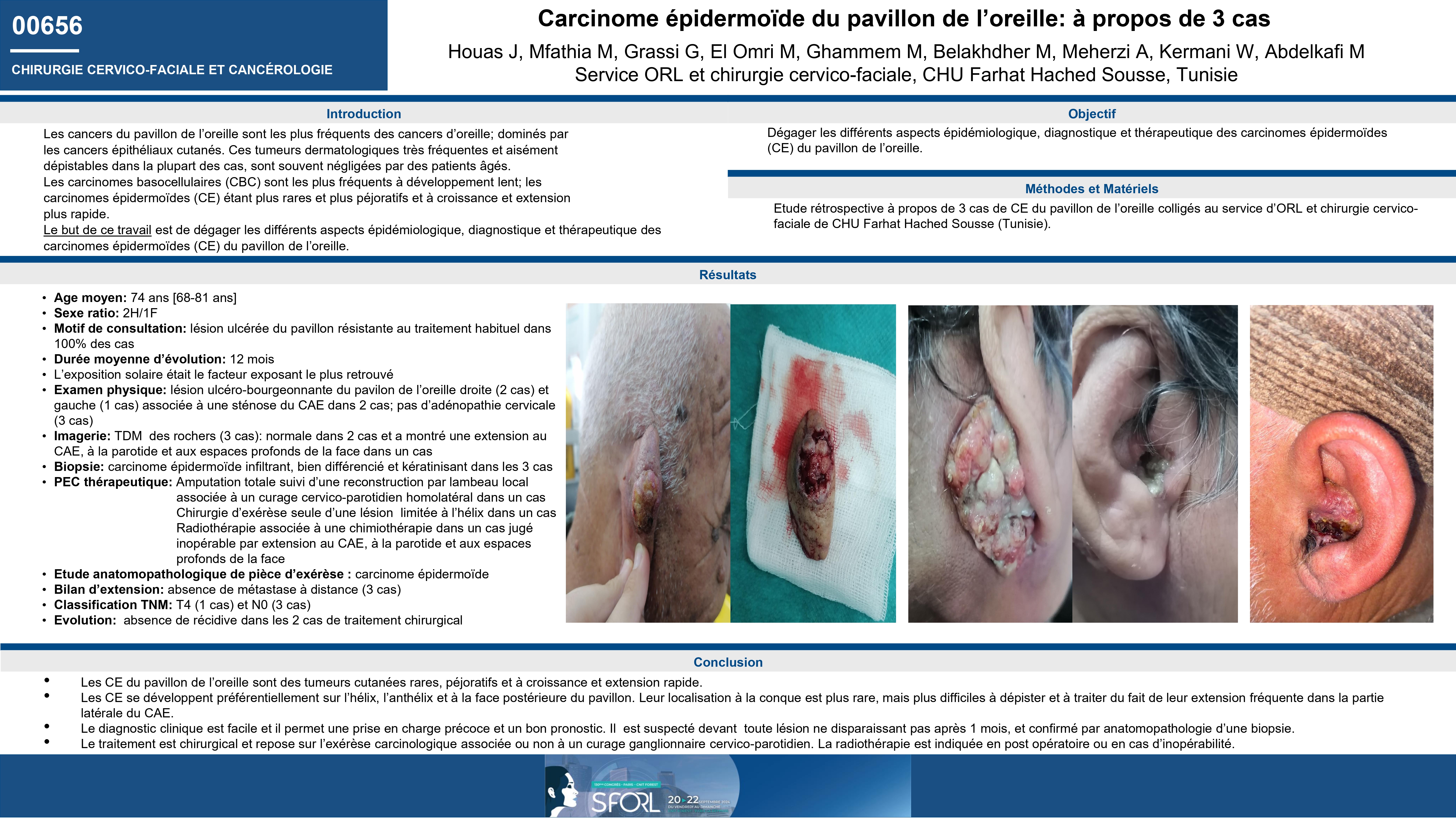 | P050 – Carcinome épidermoïde du pavillon de l’oreille: à propos de 3 cas | Chirurgie cervico-faciale et Cancérologie | chirurgie-cervico-faciale-et-cancerologie | |