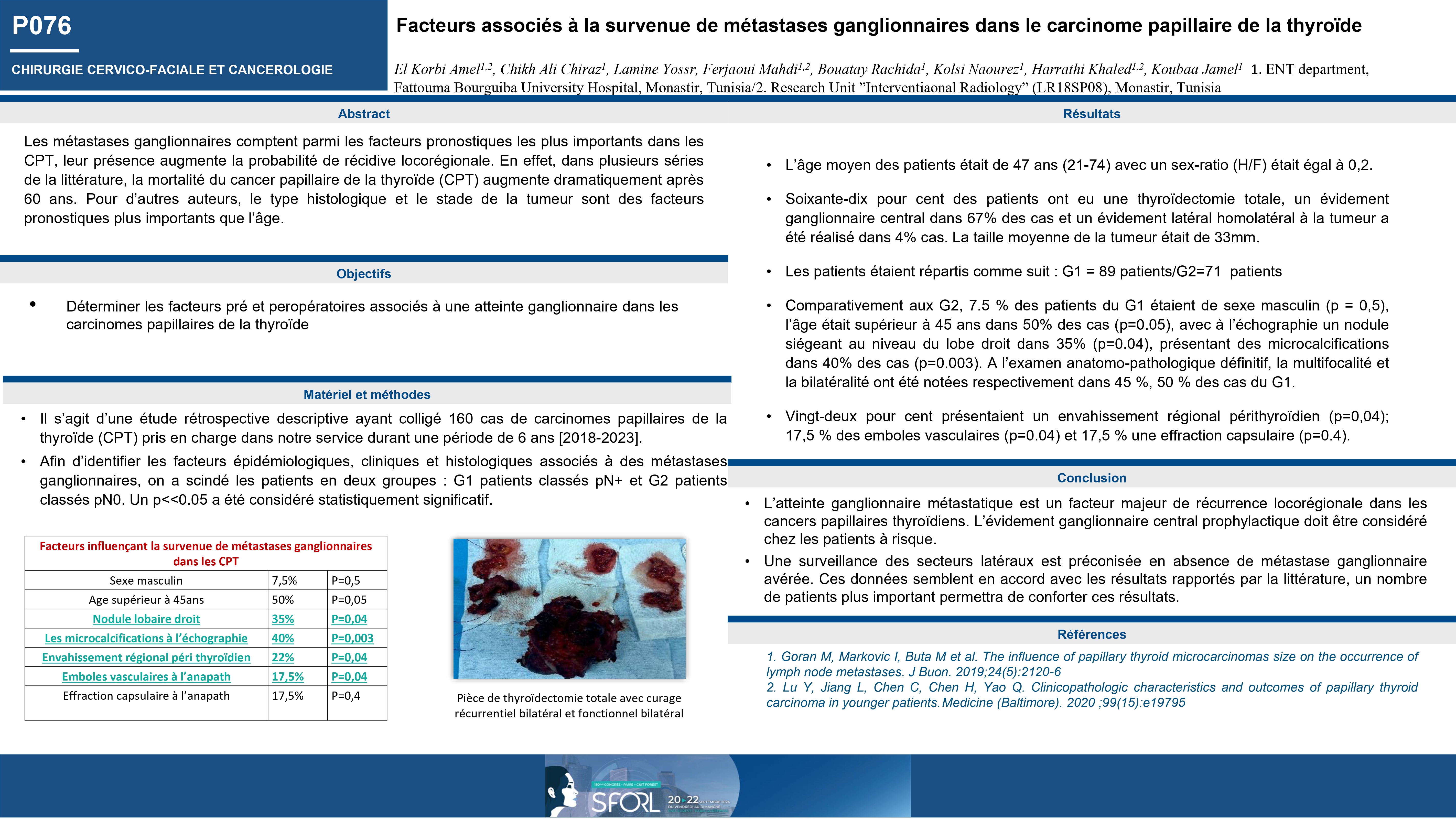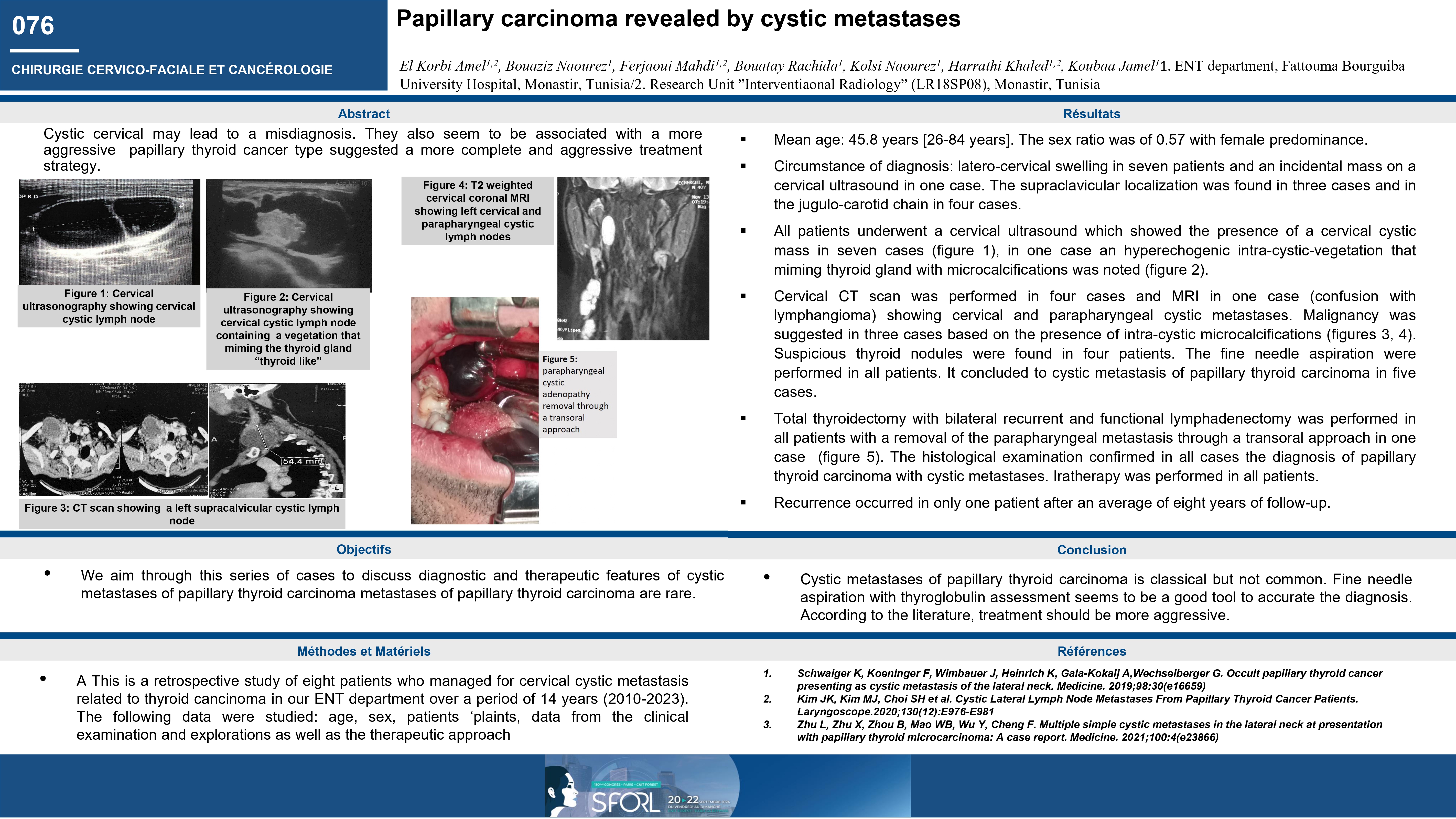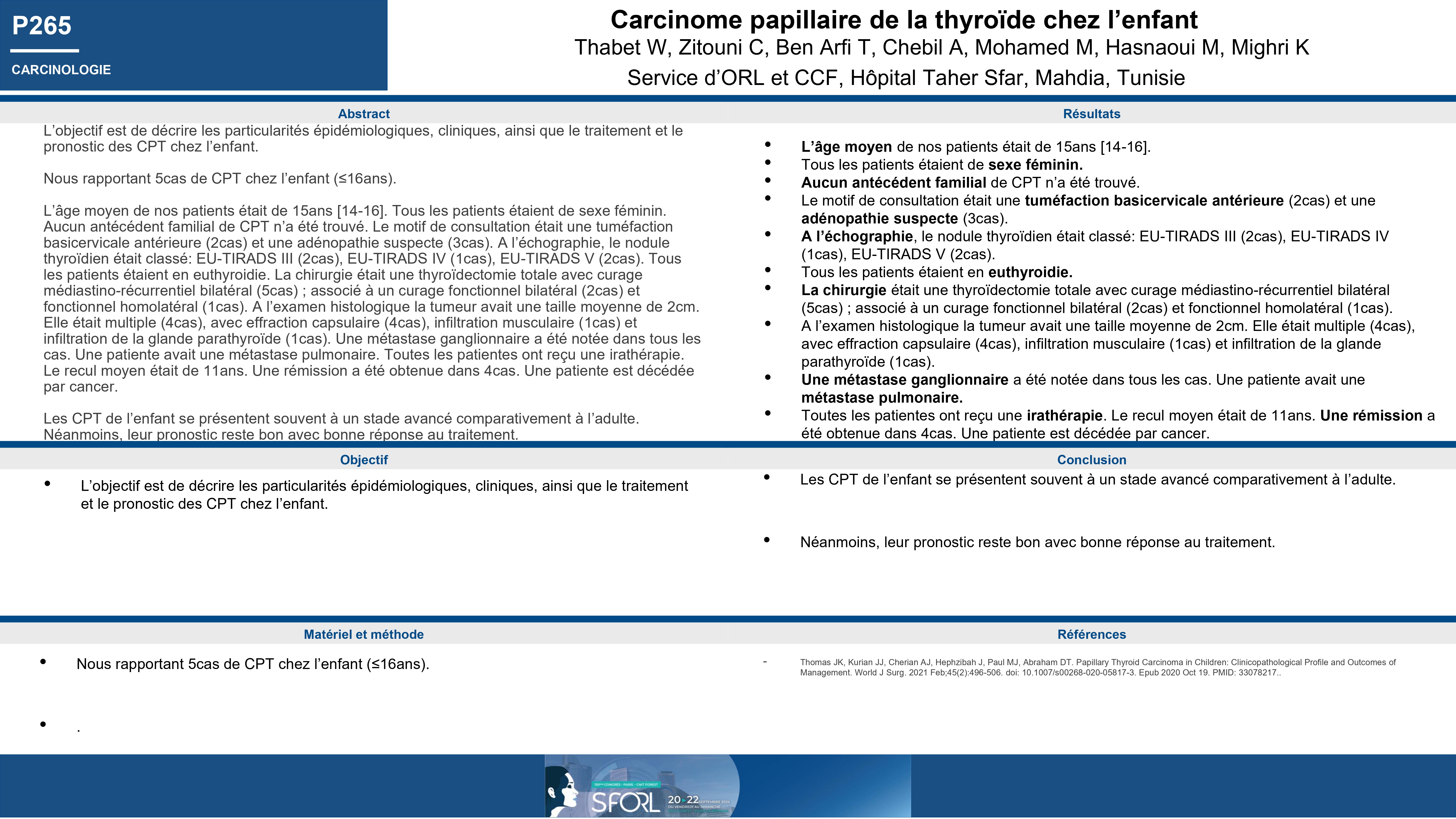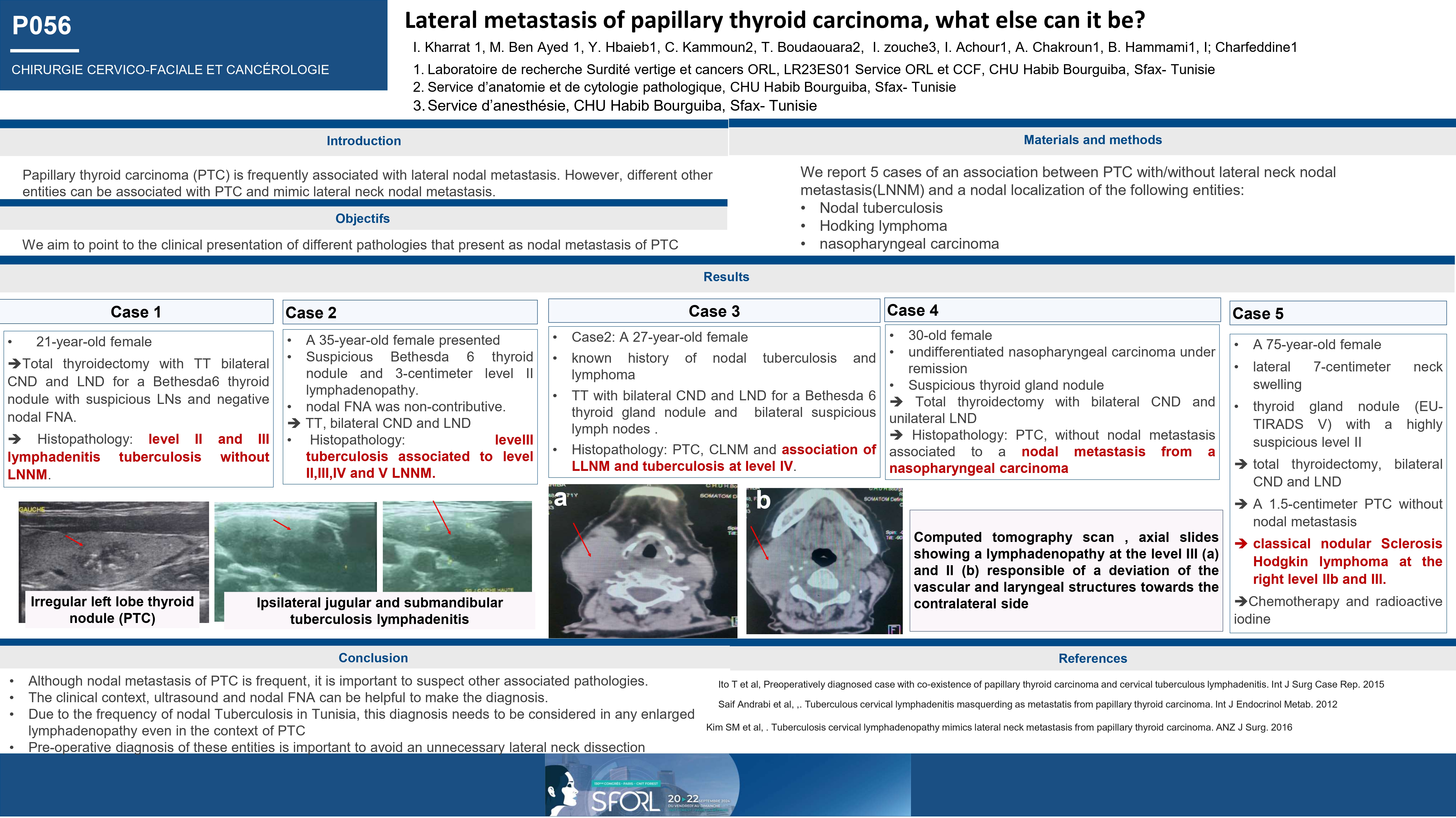 | P056 – Lateral metastasis of papillary thyroid carcinoma, what else can it be? | Chirurgie cervico-faciale et Cancérologie | chirurgie-cervico-faciale-et-cancerologie | |