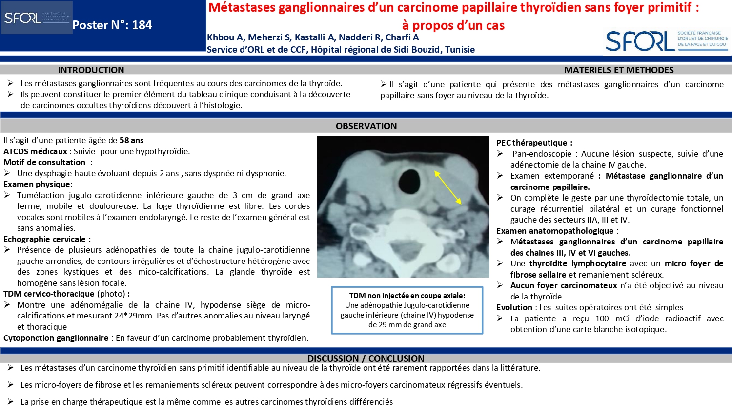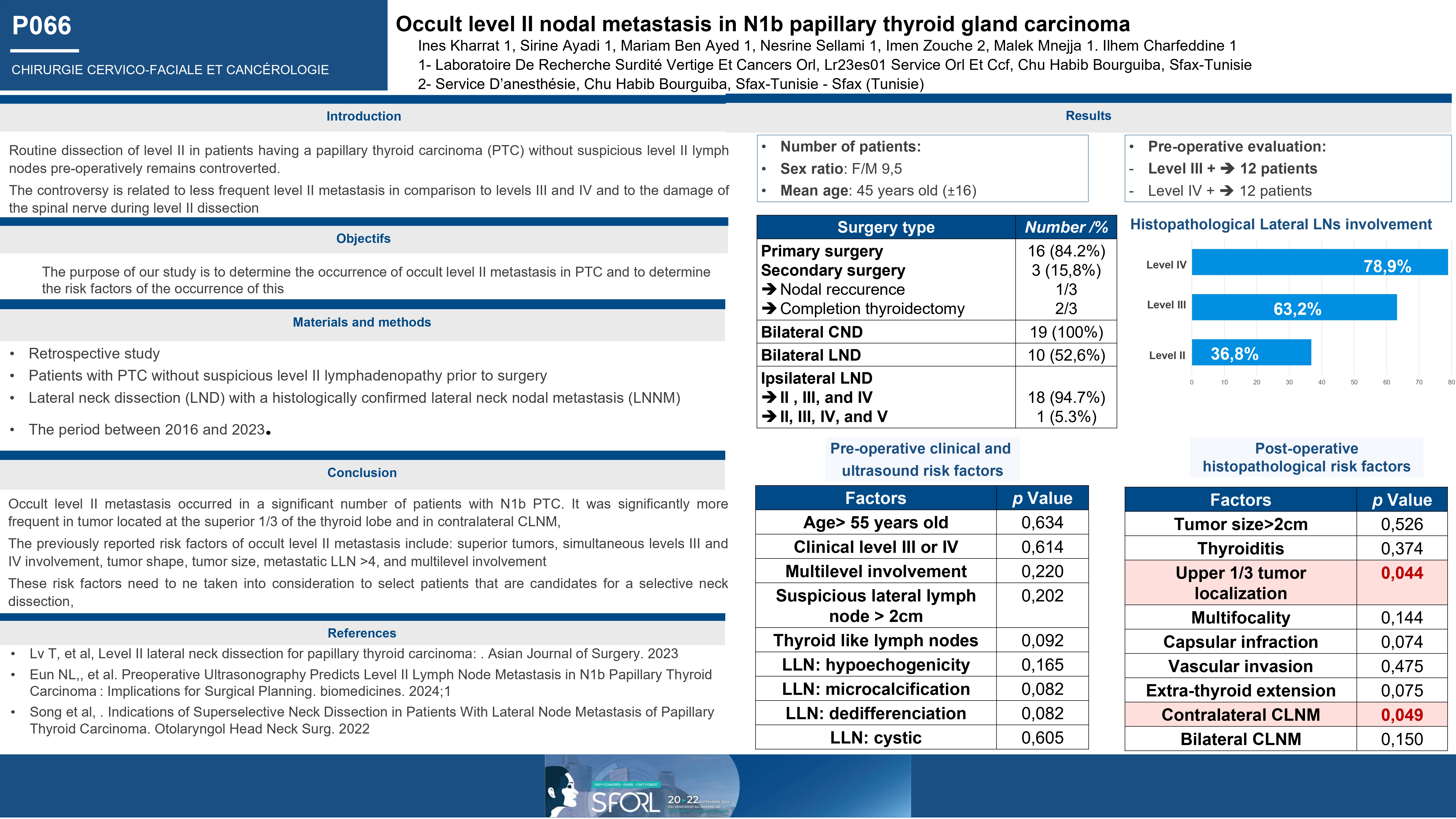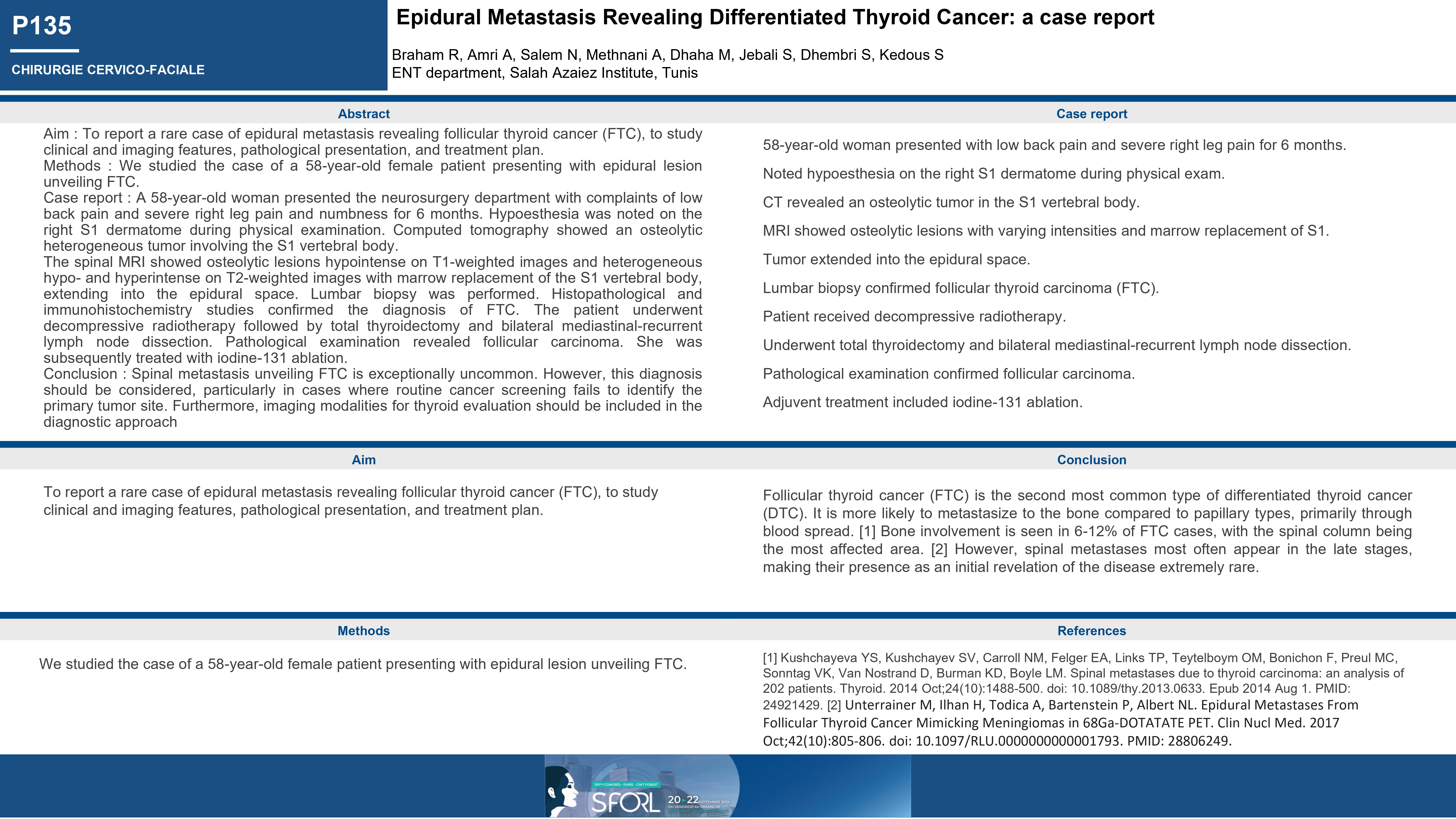 | P056 – Lateral metastasis of papillary thyroid carcinoma, what else can it be? | Chirurgie cervico-faciale et Cancérologie | chirurgie-cervico-faciale-et-cancerologie | |