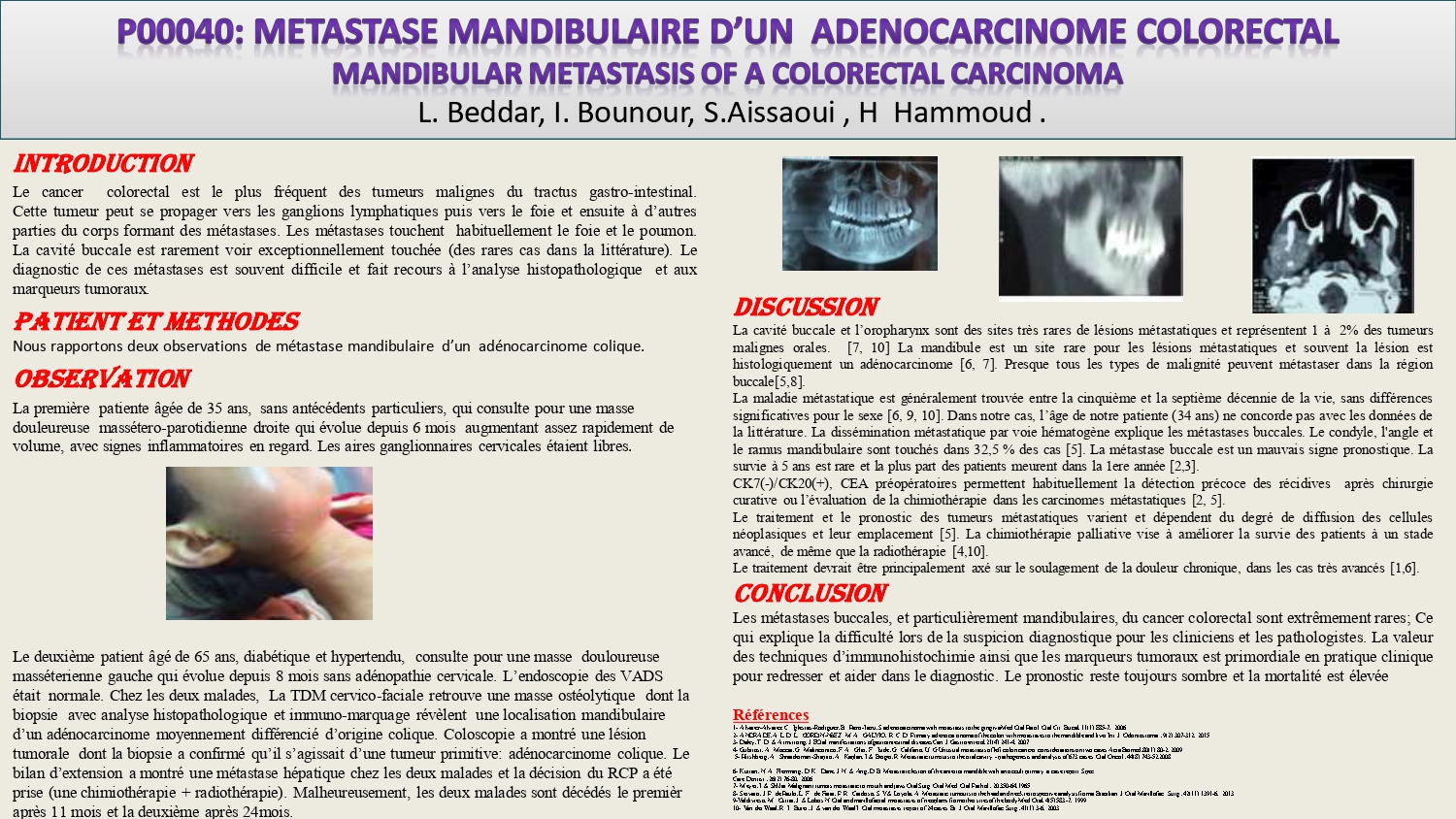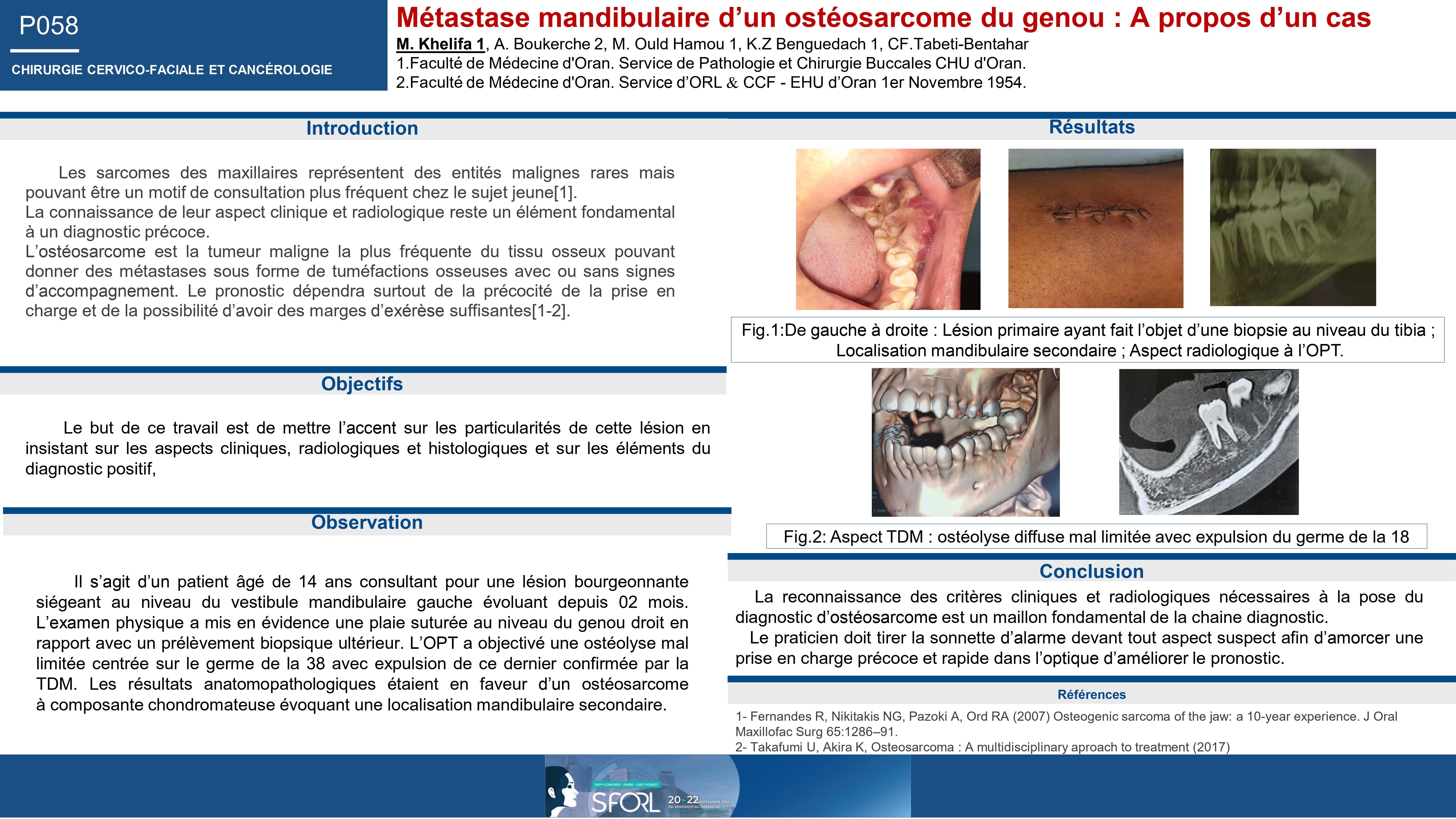 | P058 – Métastase mandibulaire d’un ostéosarcome du genou : A propos d’un cas | Chirurgie cervico-faciale et Cancérologie | chirurgie-cervico-faciale-et-cancerologie | |