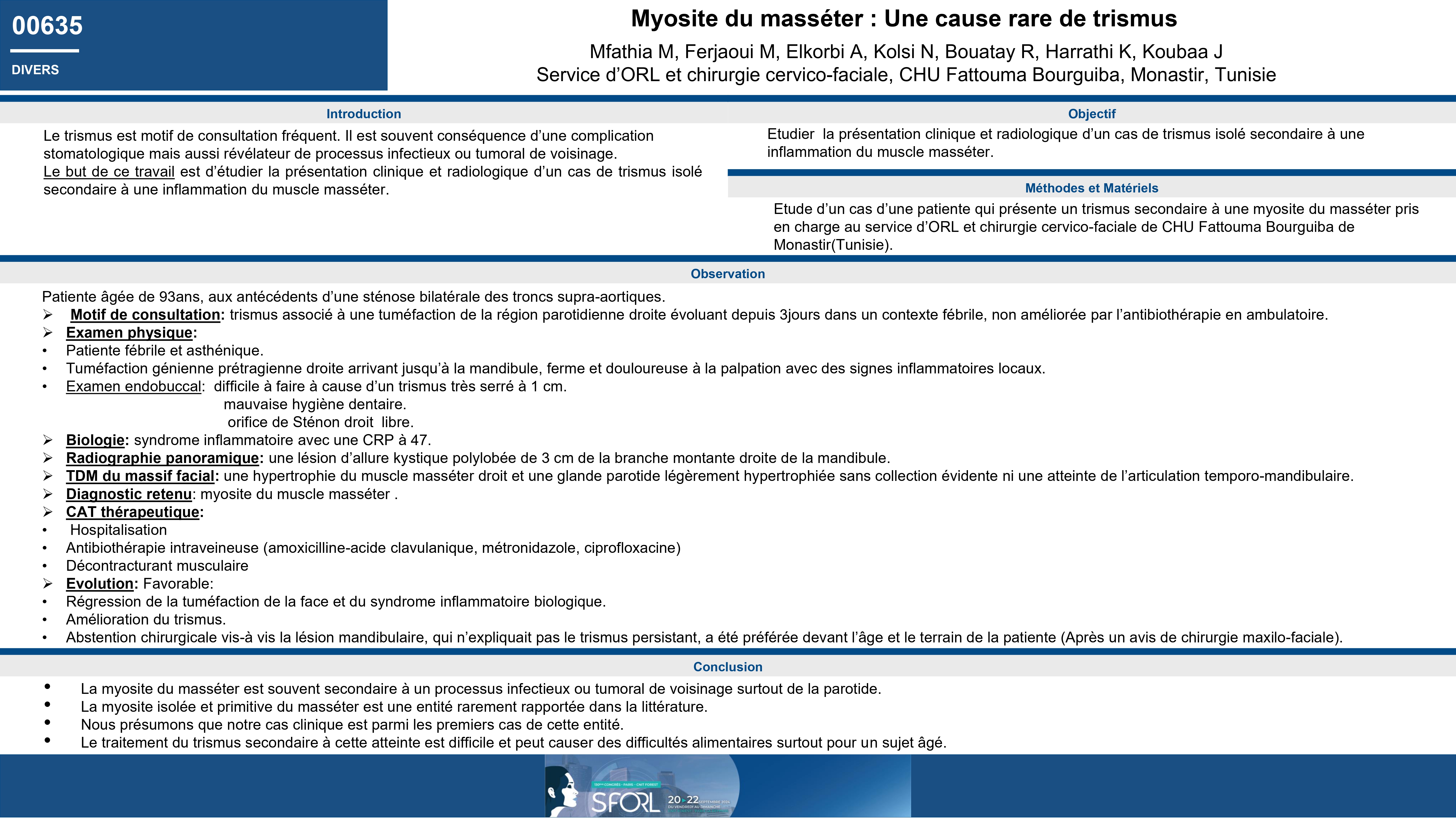 | P059 – Myosite du masséter : Une cause rare de trismus | Chirurgie cervico-faciale et Cancérologie | chirurgie-cervico-faciale-et-cancerologie | |