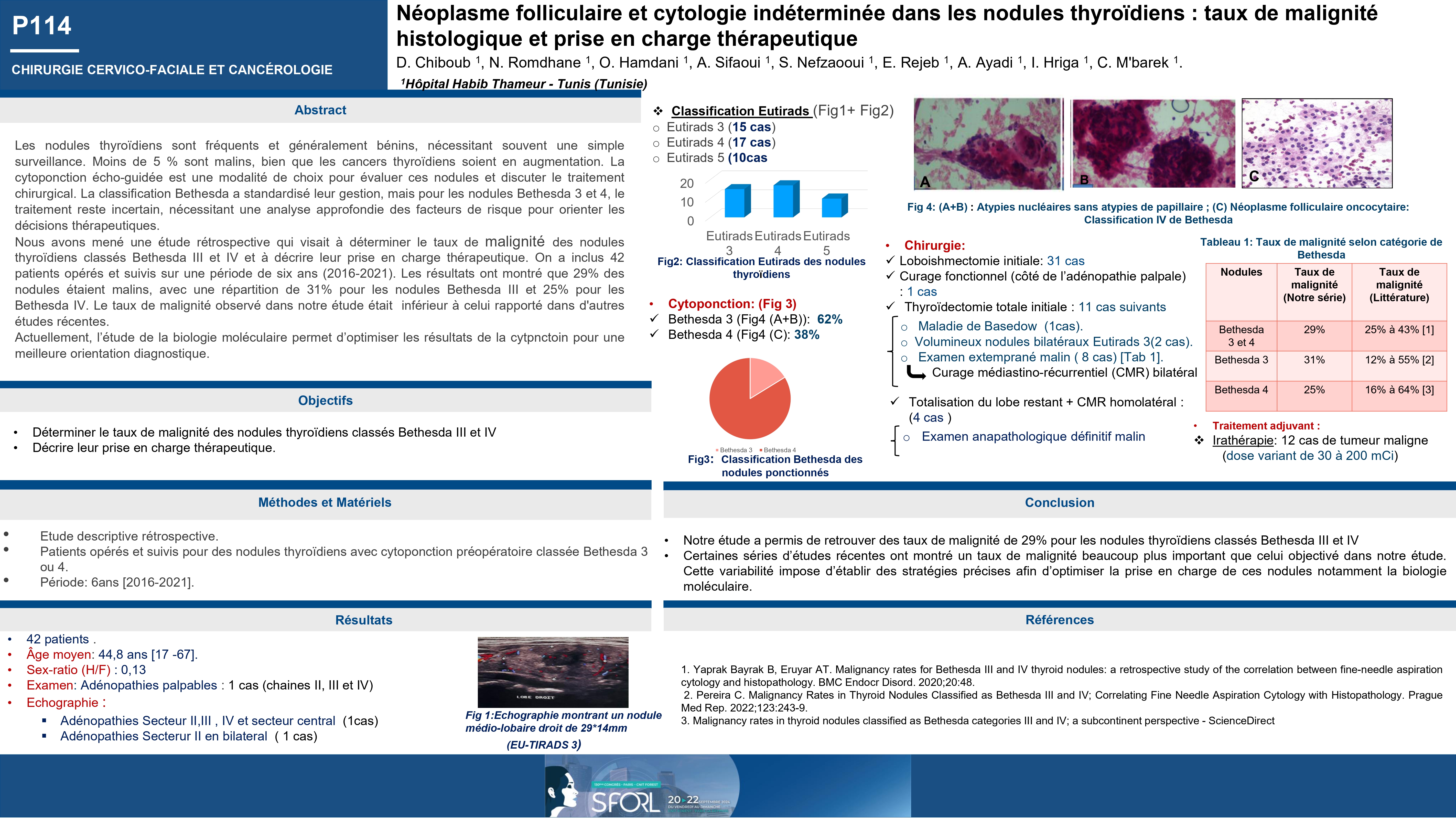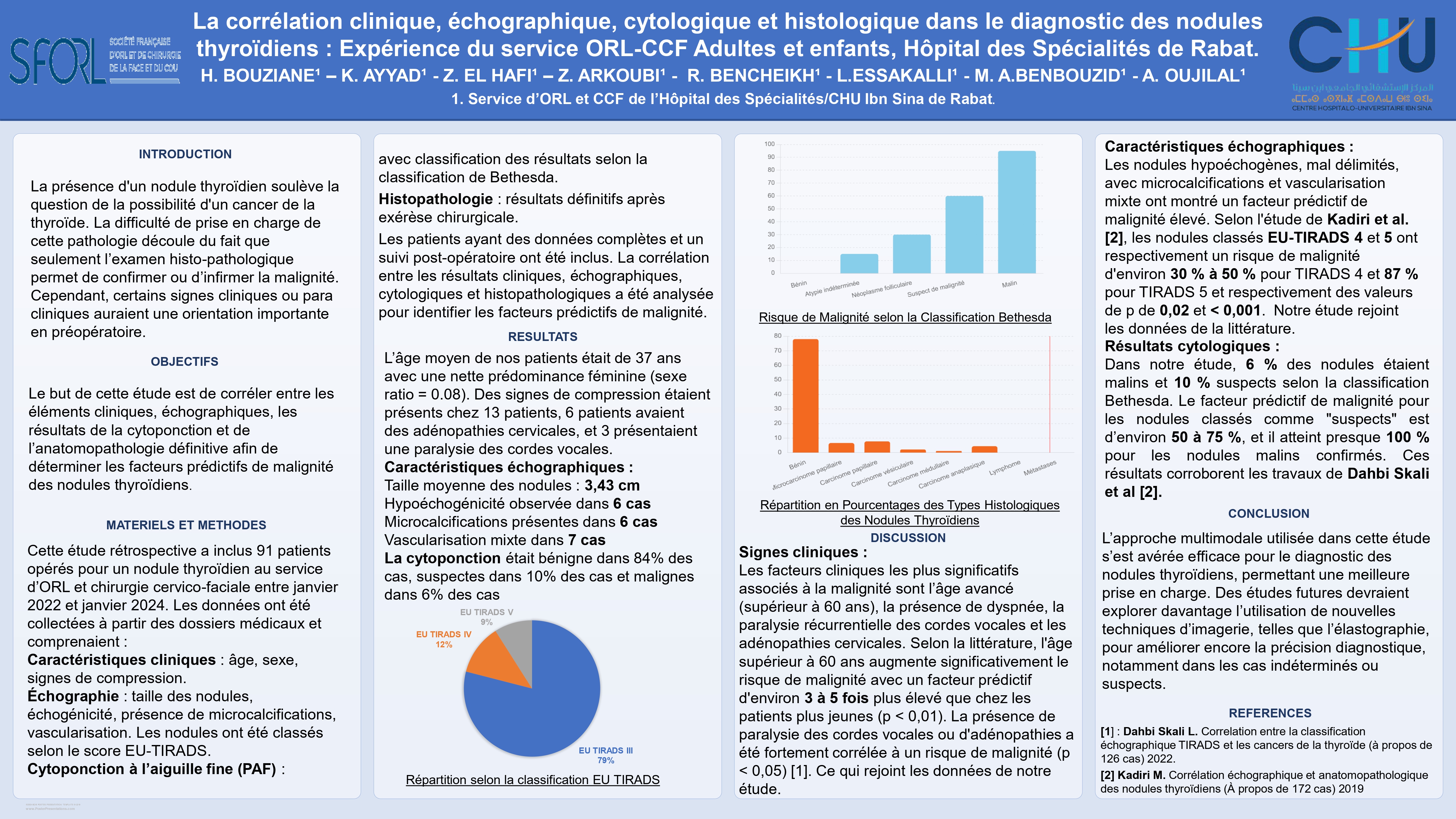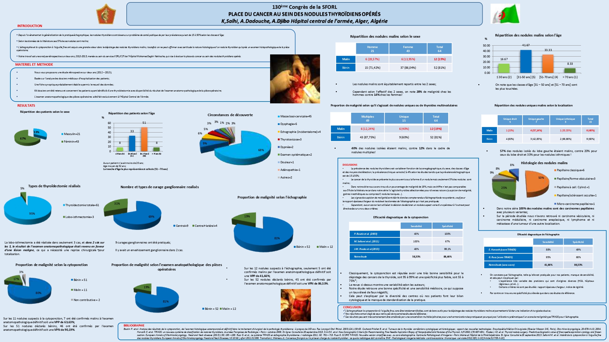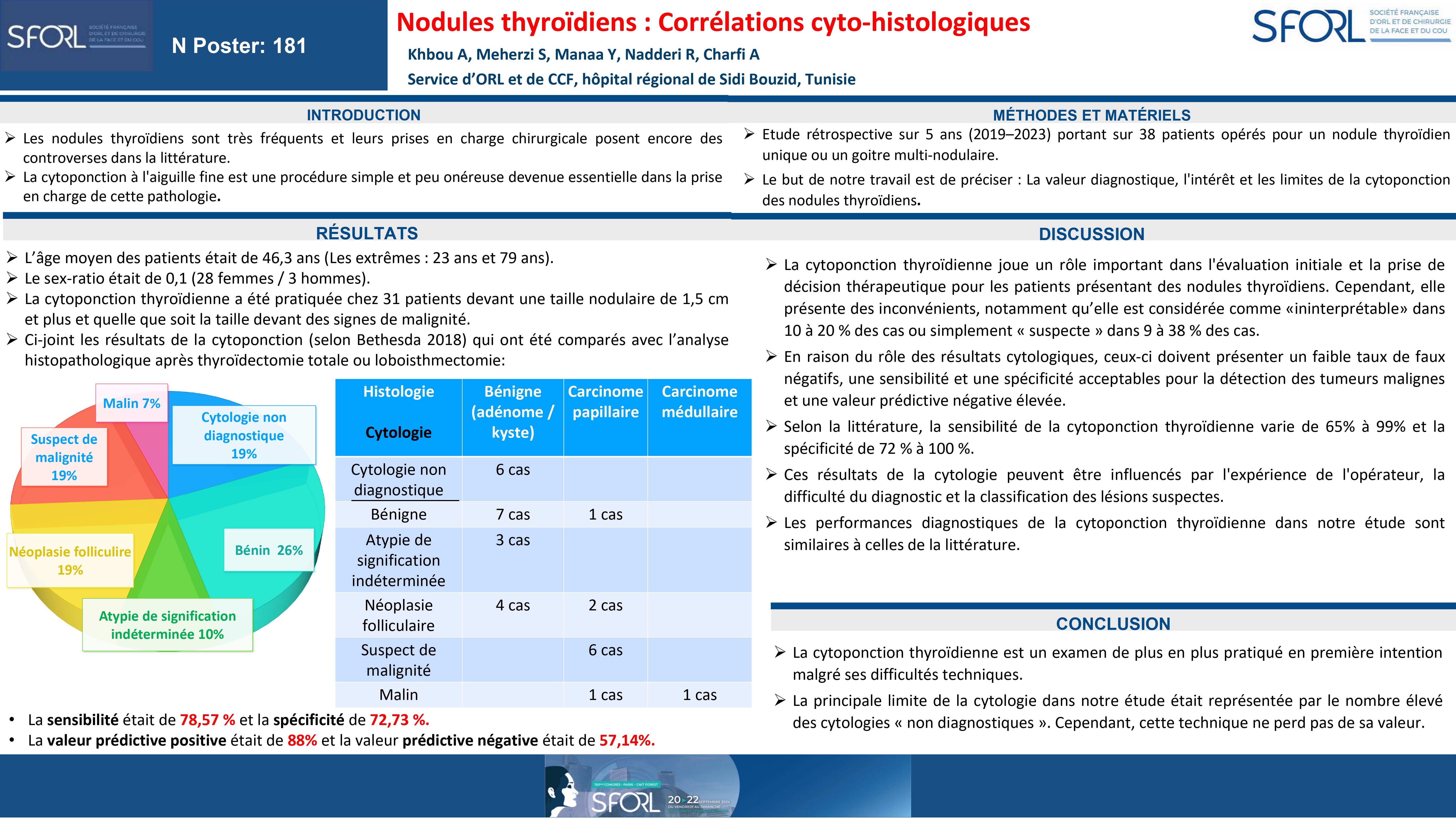 | P060 – La corrélation clinique, échographique, cytologique et histologique dans le diagnostic des nodules thyroïdiens. | Chirurgie cervico-faciale et Cancérologie | chirurgie-cervico-faciale-et-cancerologie | |