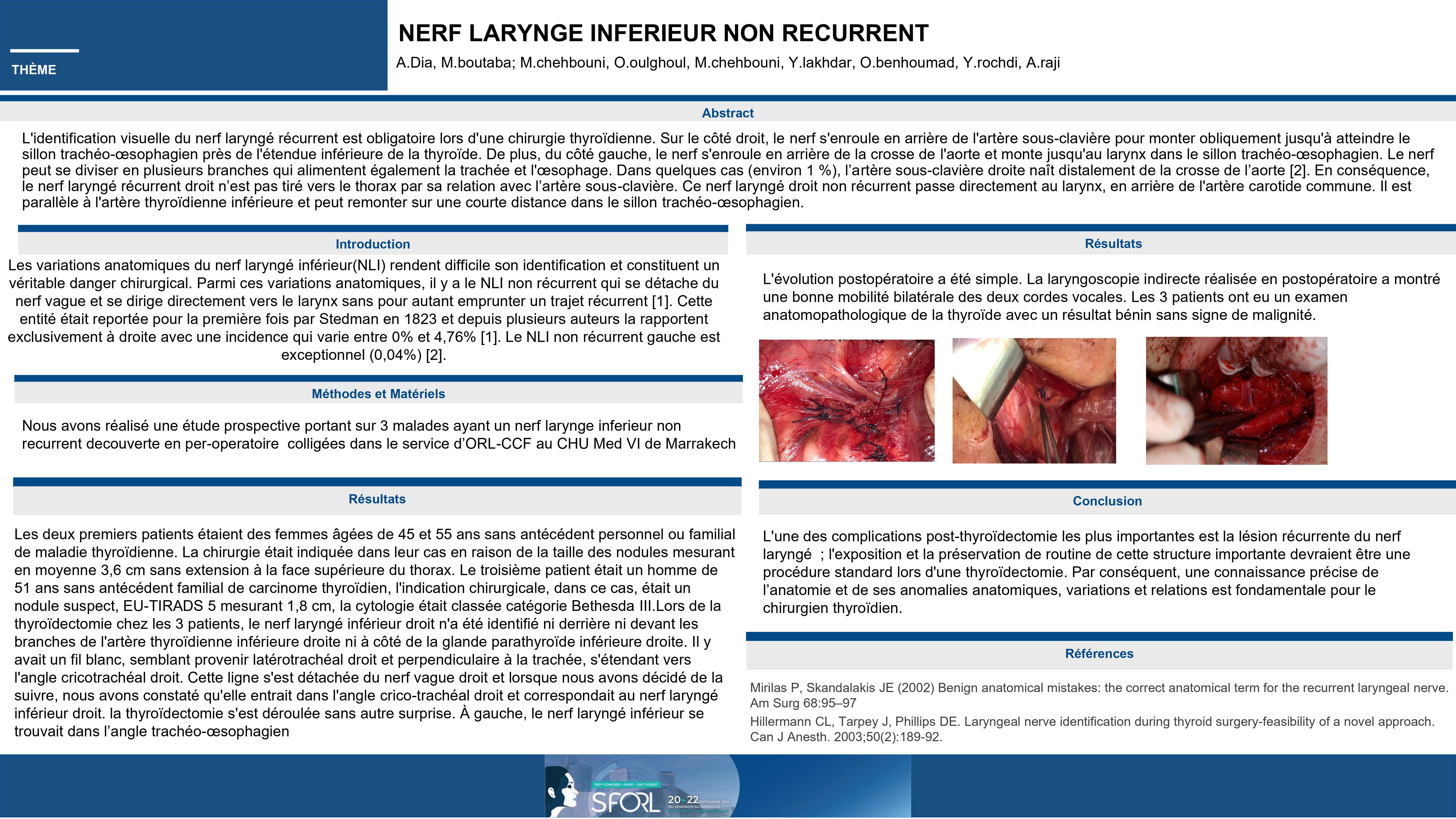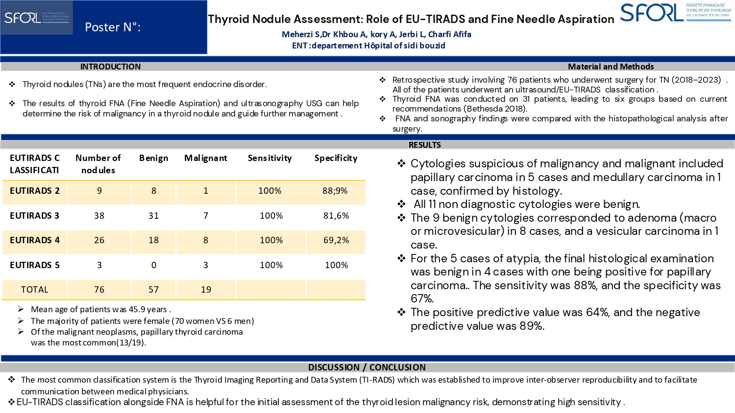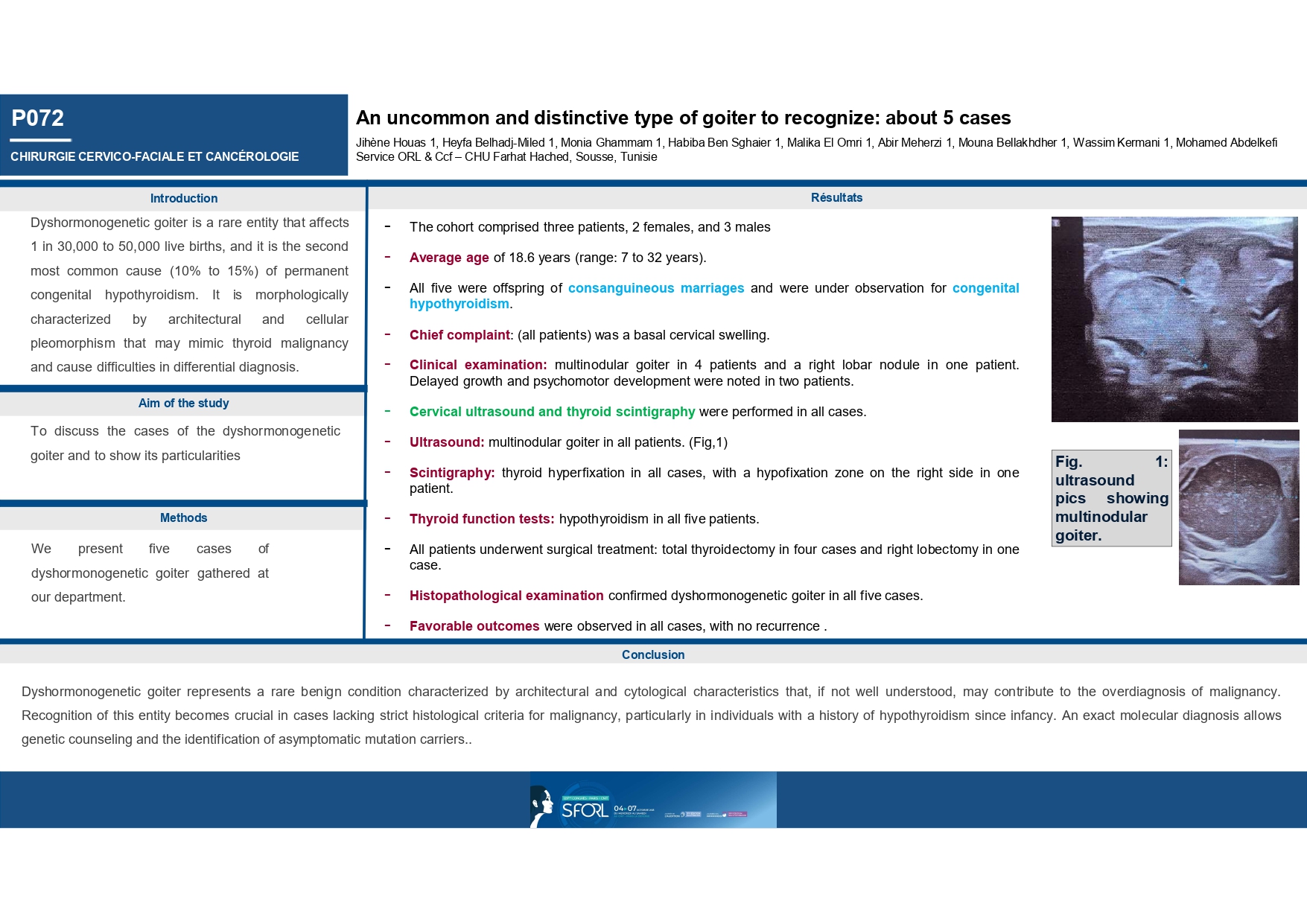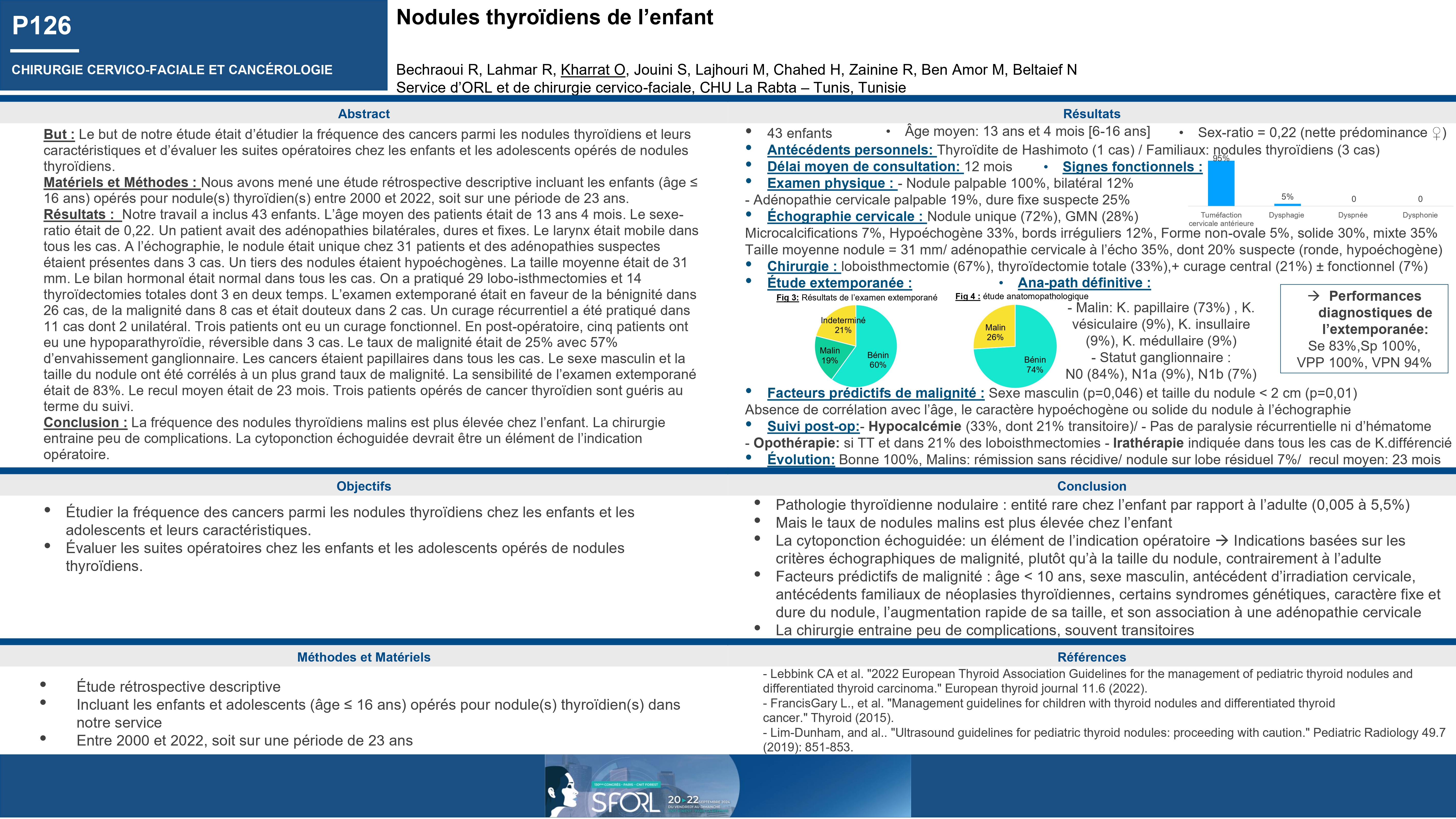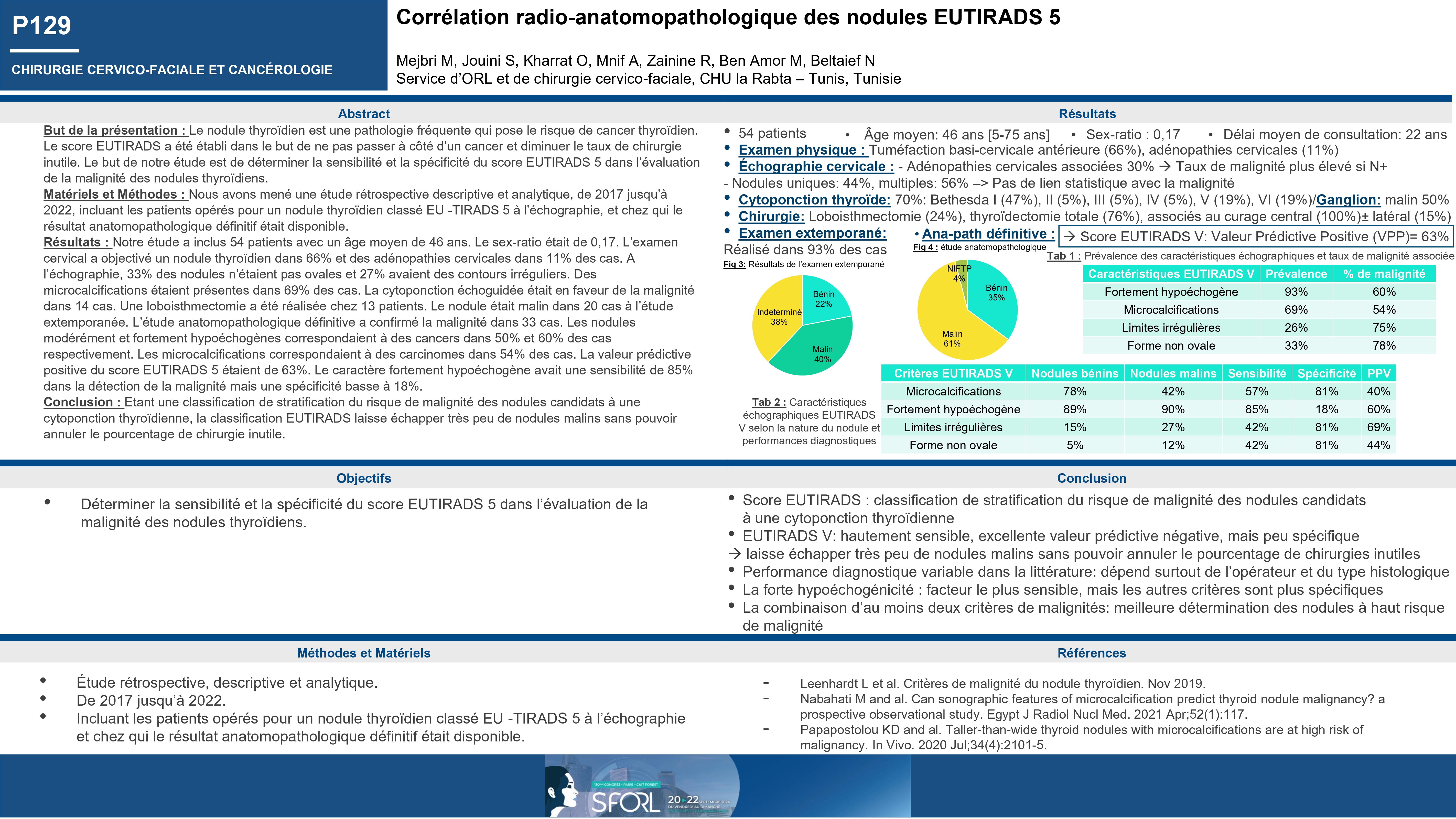 | P060 – La corrélation clinique, échographique, cytologique et histologique dans le diagnostic des nodules thyroïdiens. | Chirurgie cervico-faciale et Cancérologie | chirurgie-cervico-faciale-et-cancerologie | |