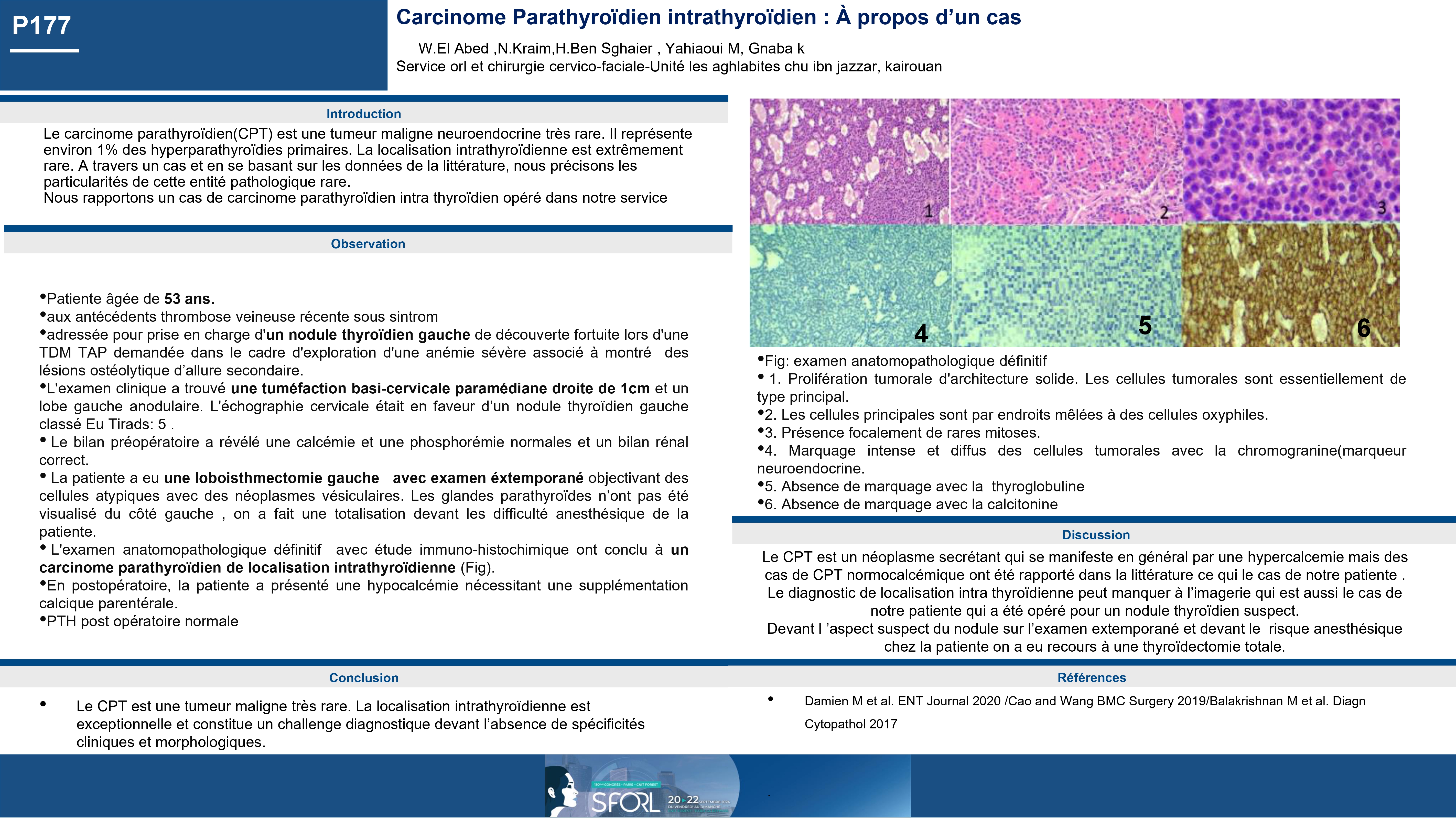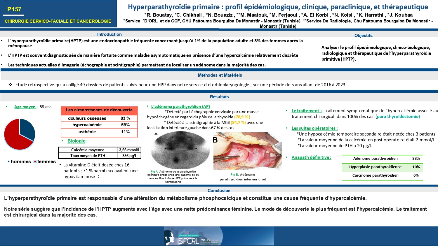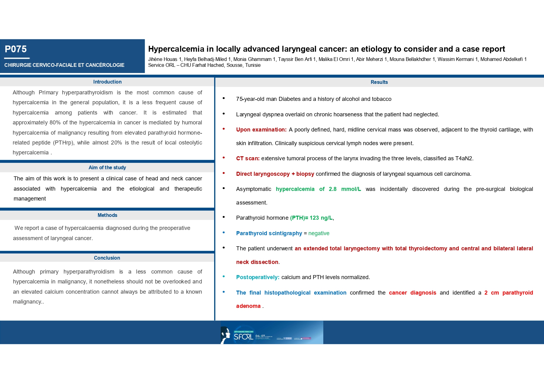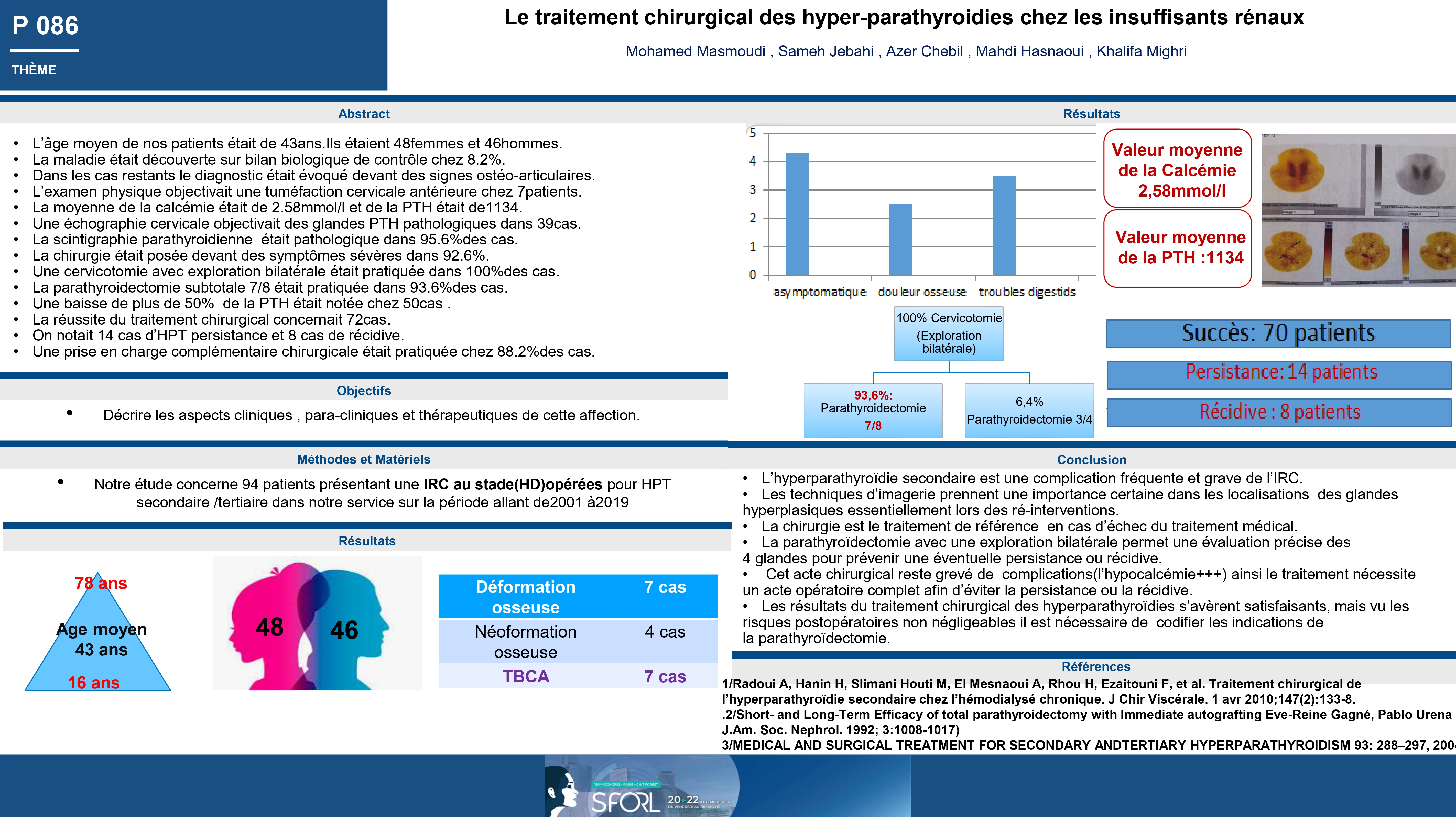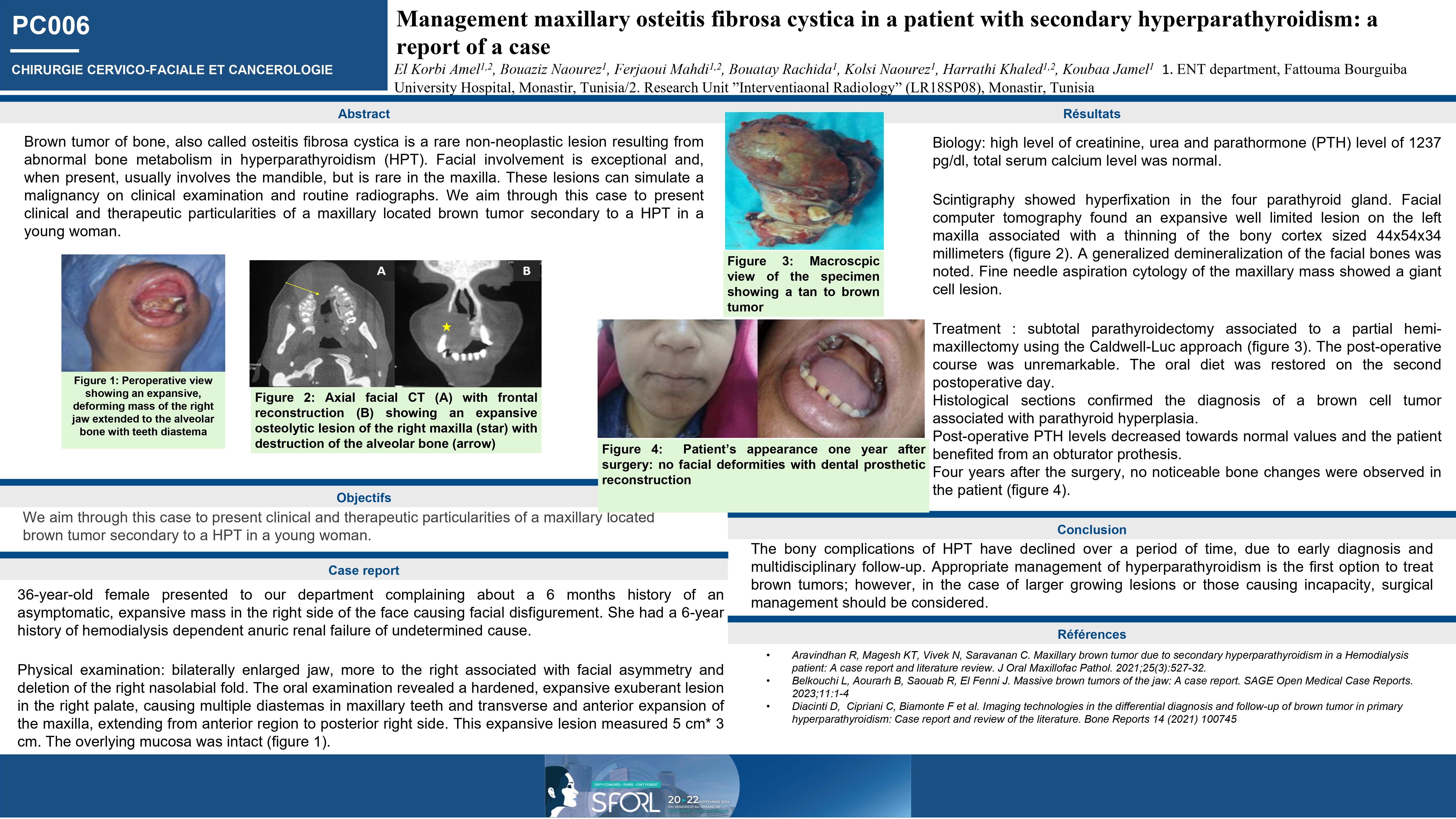 | PC006 – Prise en charge de « l’osteitis fibrosa cystica » chez une patiente porteuse d’un hyperparathyroidie secondaire | Chirurgie cervico-faciale et Cancérologie | chirurgie-cervico-faciale-et-cancerologie | |