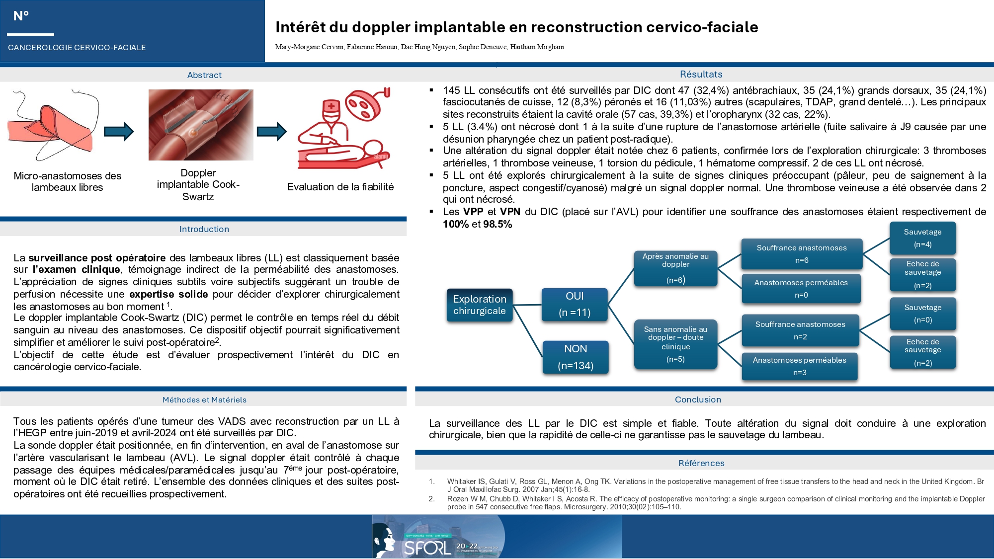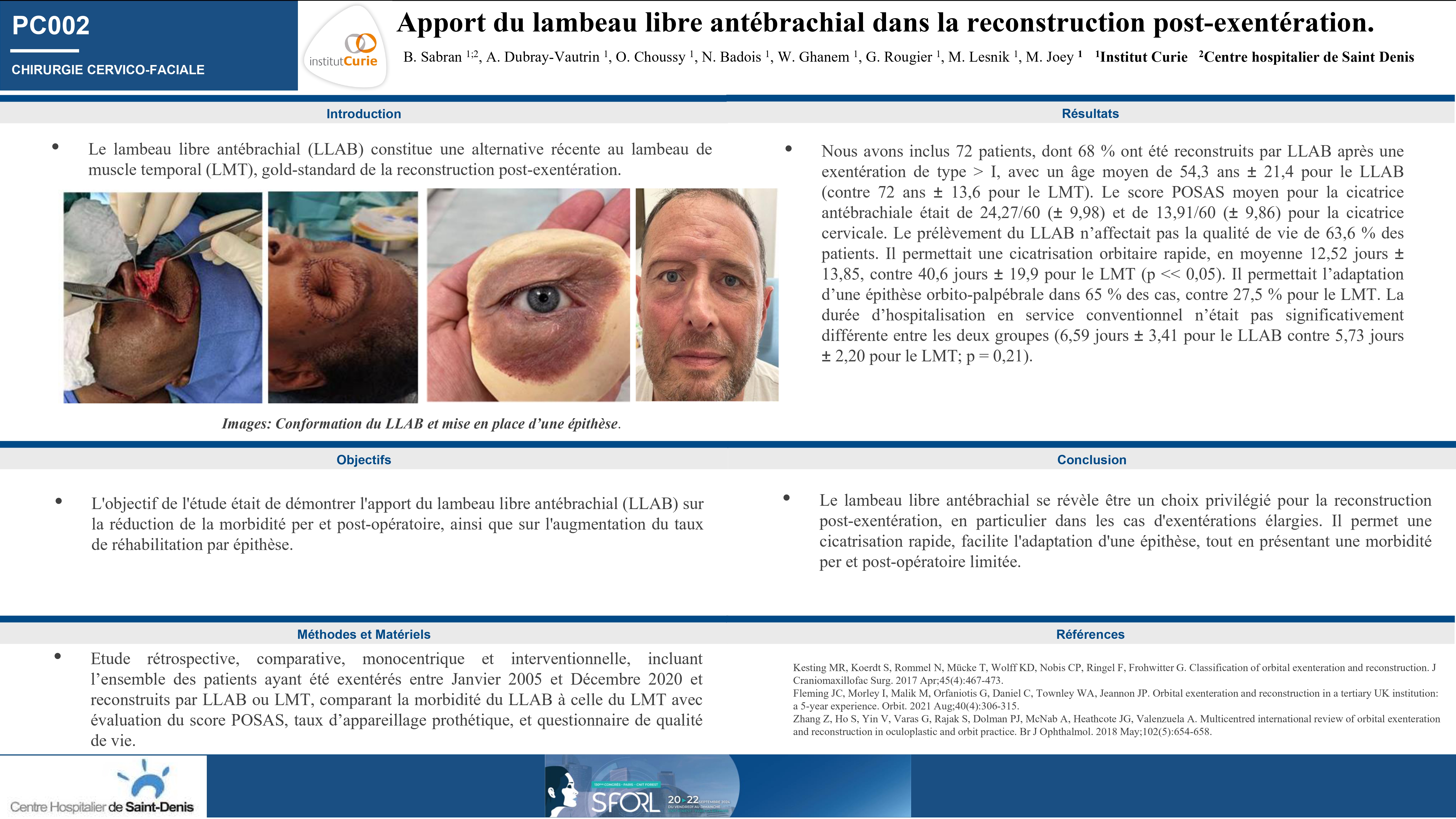 | PC002 – Apport du lambeau libre antébrachial dans la reconstruction post-exentération. | Chirurgie cervico-faciale et Cancérologie | chirurgie-cervico-faciale-et-cancerologie | |