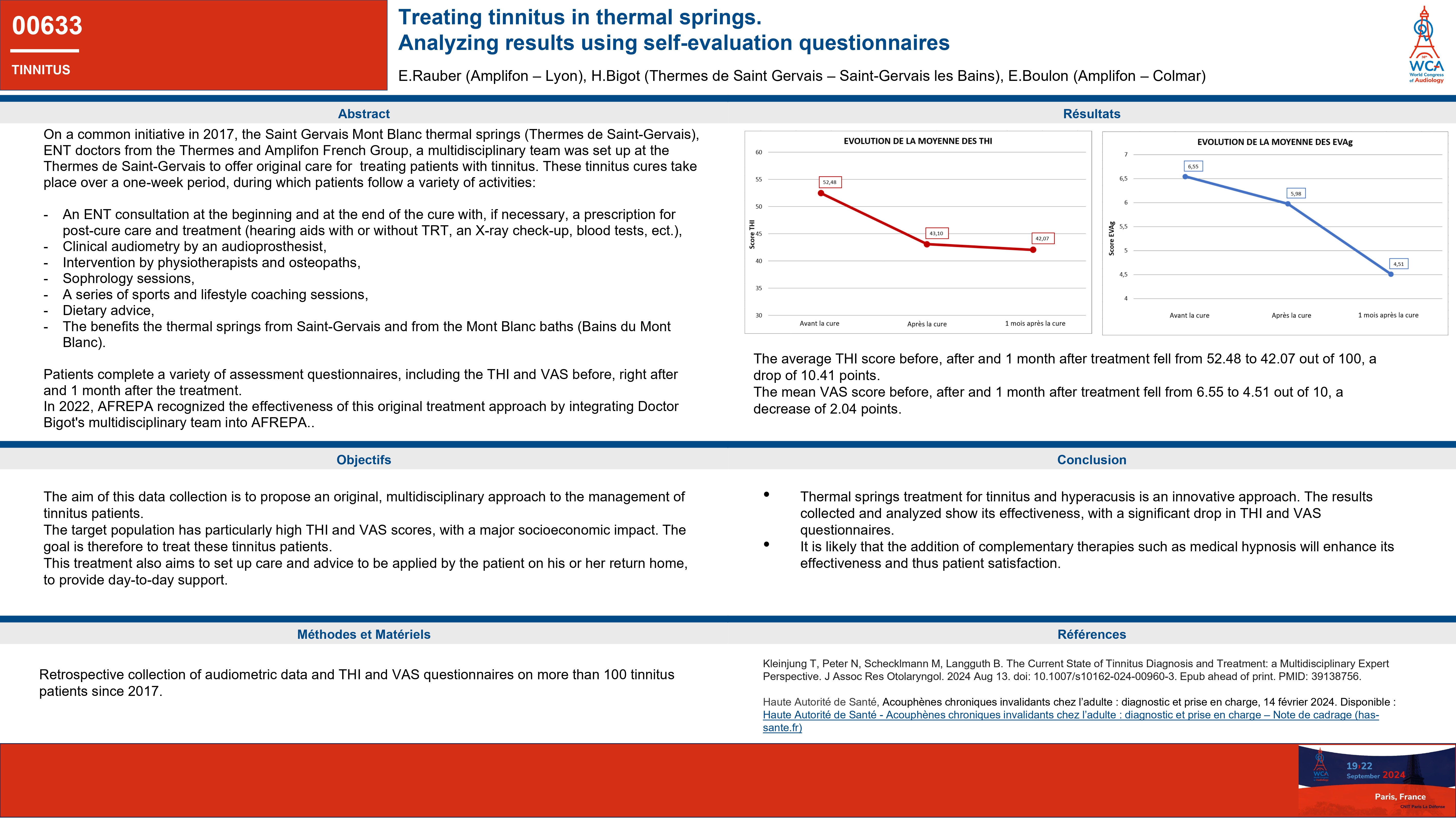 | P499 – Treating tinnitus in thermal springs. Analyzing results using self-evaluation questionnaires | Tinnitus and Hypercusis | tinnitus-and-hypercusis | |