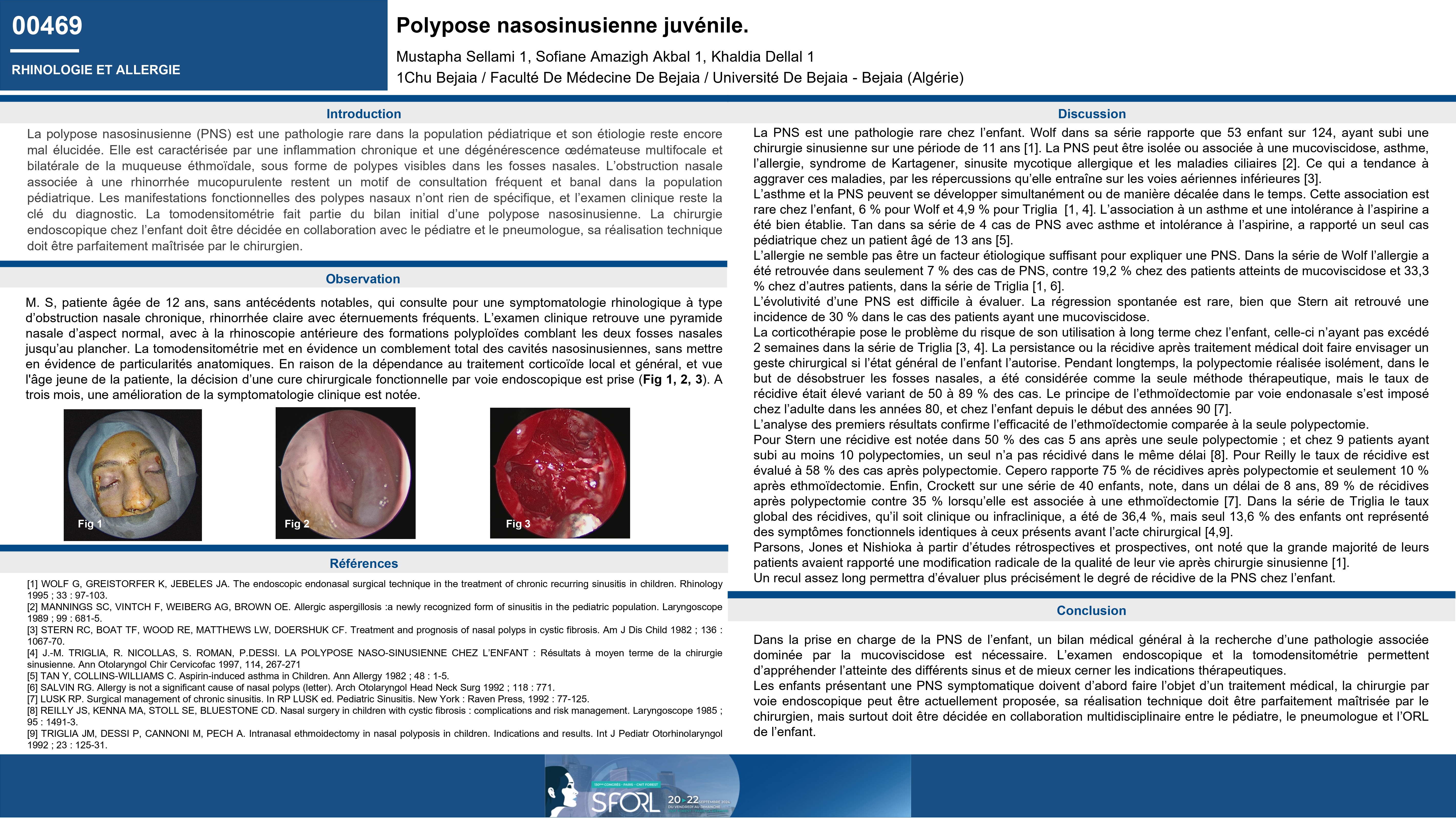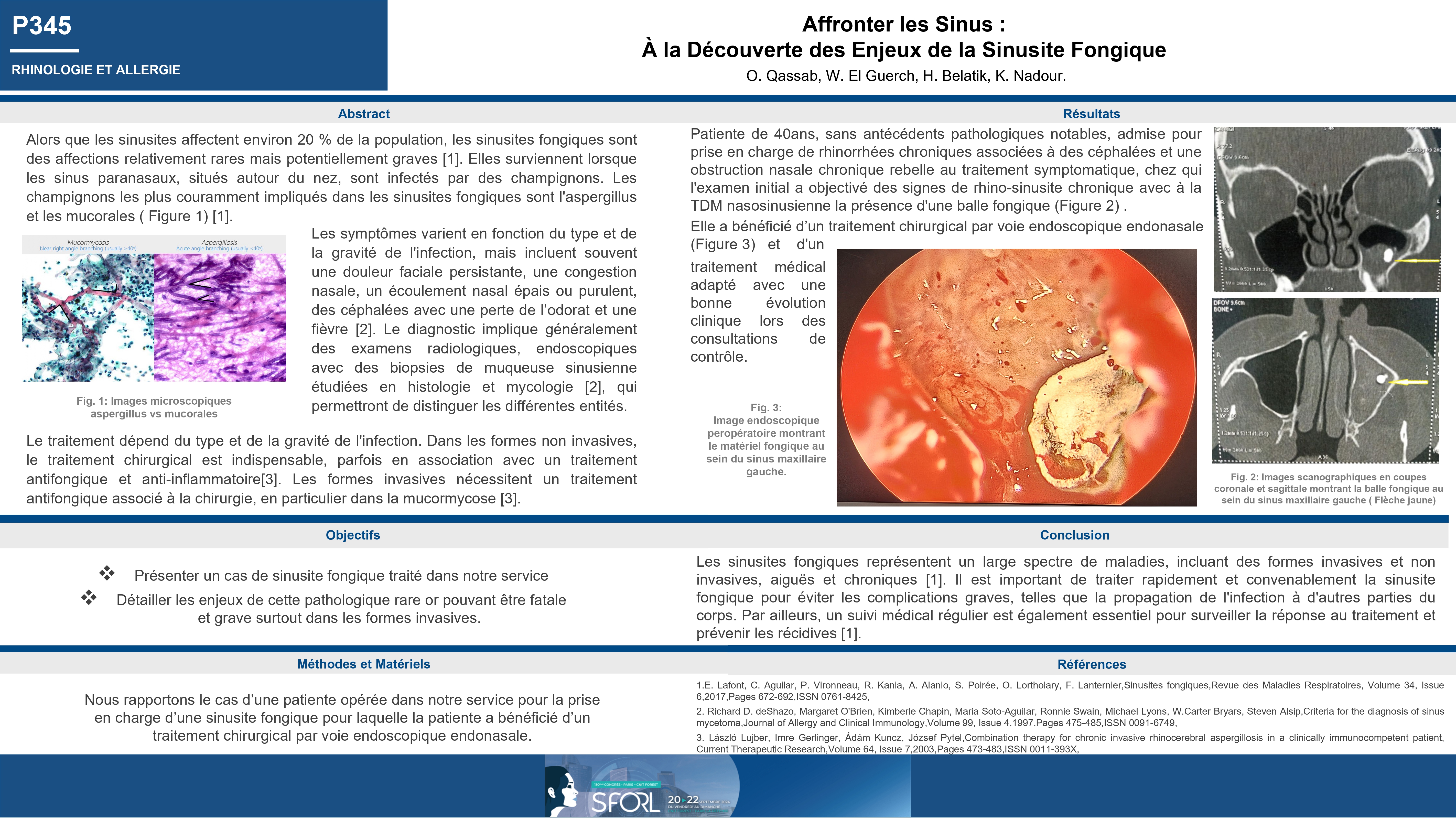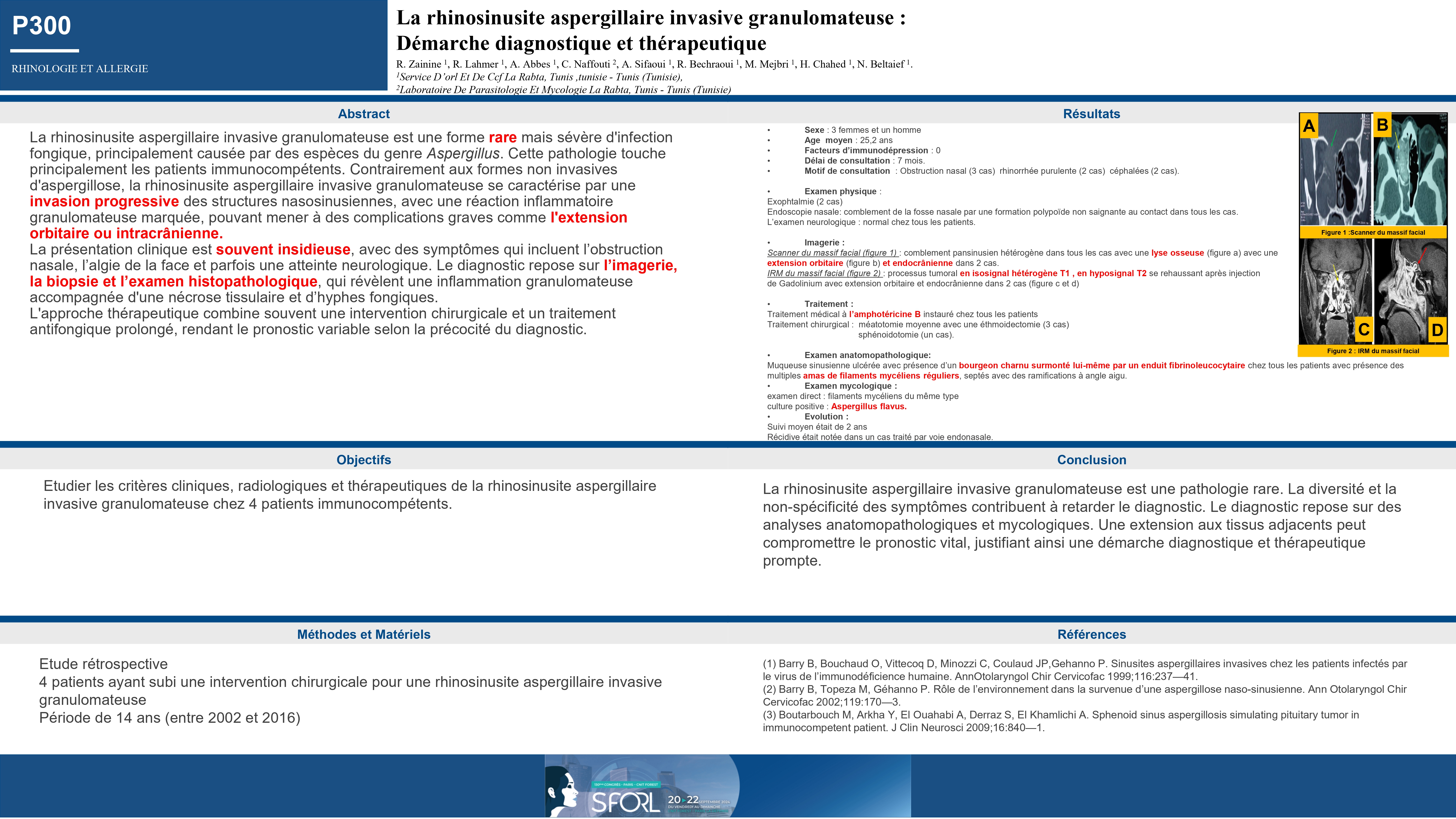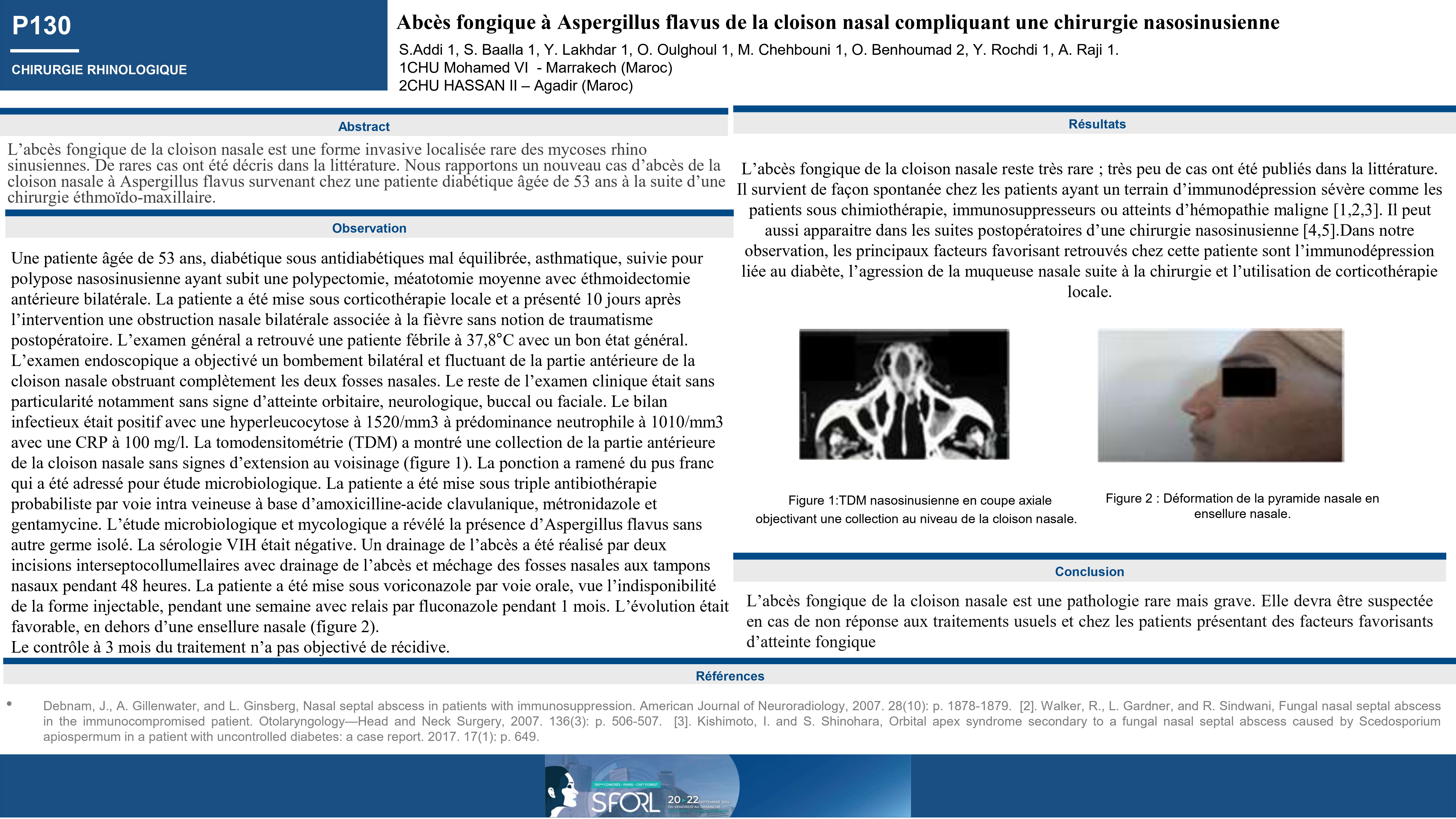 | PC046 – Abcès fongique à Aspergillus flavus de la cloison nasal compliquant une chirurgie nasosinusienne a propos d’un cas | Rhinologie et Allergie | rhinologie-et-allergie | |