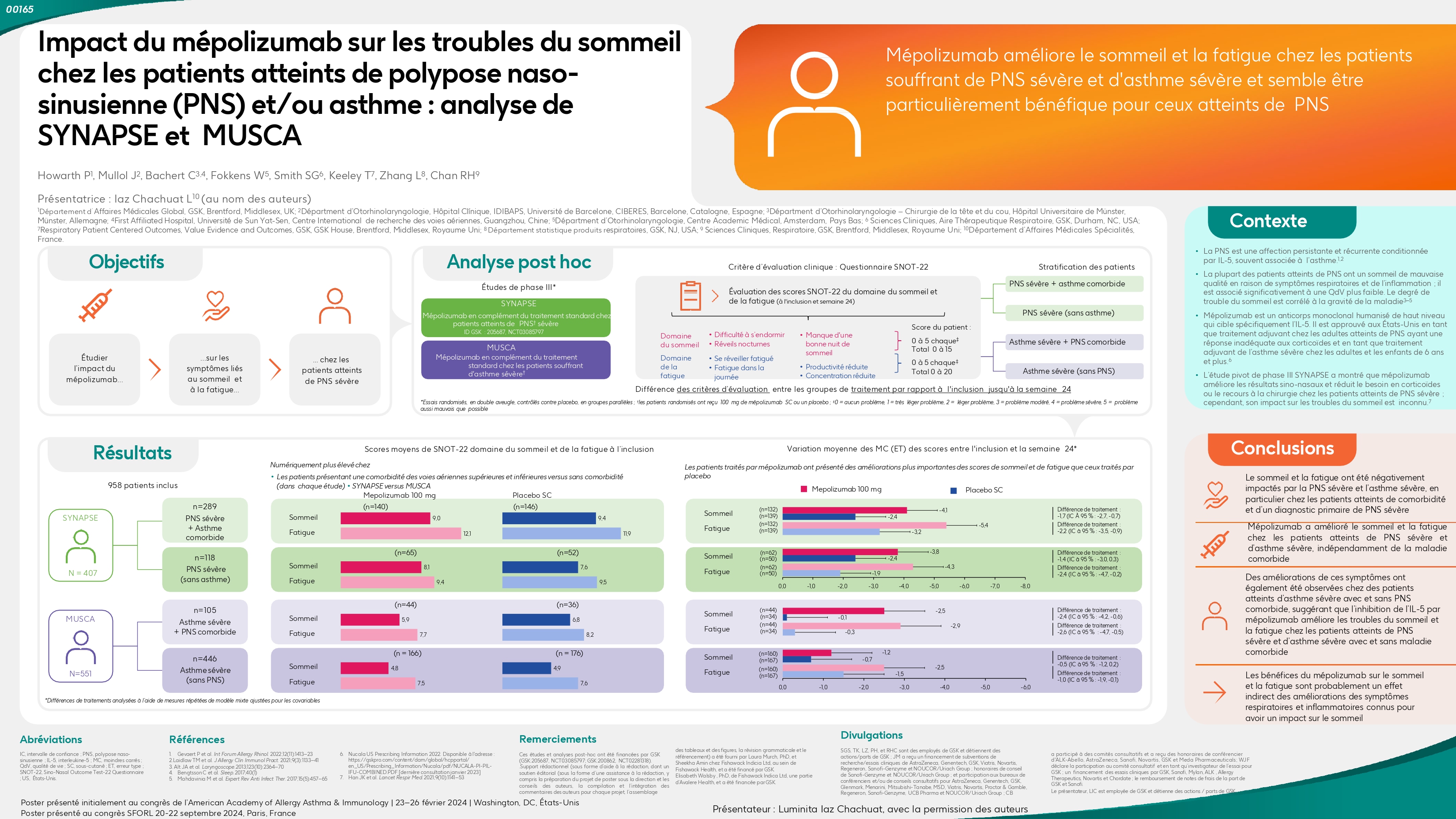 | PC038 – Impact de Mépolizumab sur les troubles du sommeil chez les patients avec polypose naso-sinusienne et/ou asthme : Analyse des études SYNAPSE et MUSCA | Rhinologie et Allergie | rhinologie-et-allergie | |