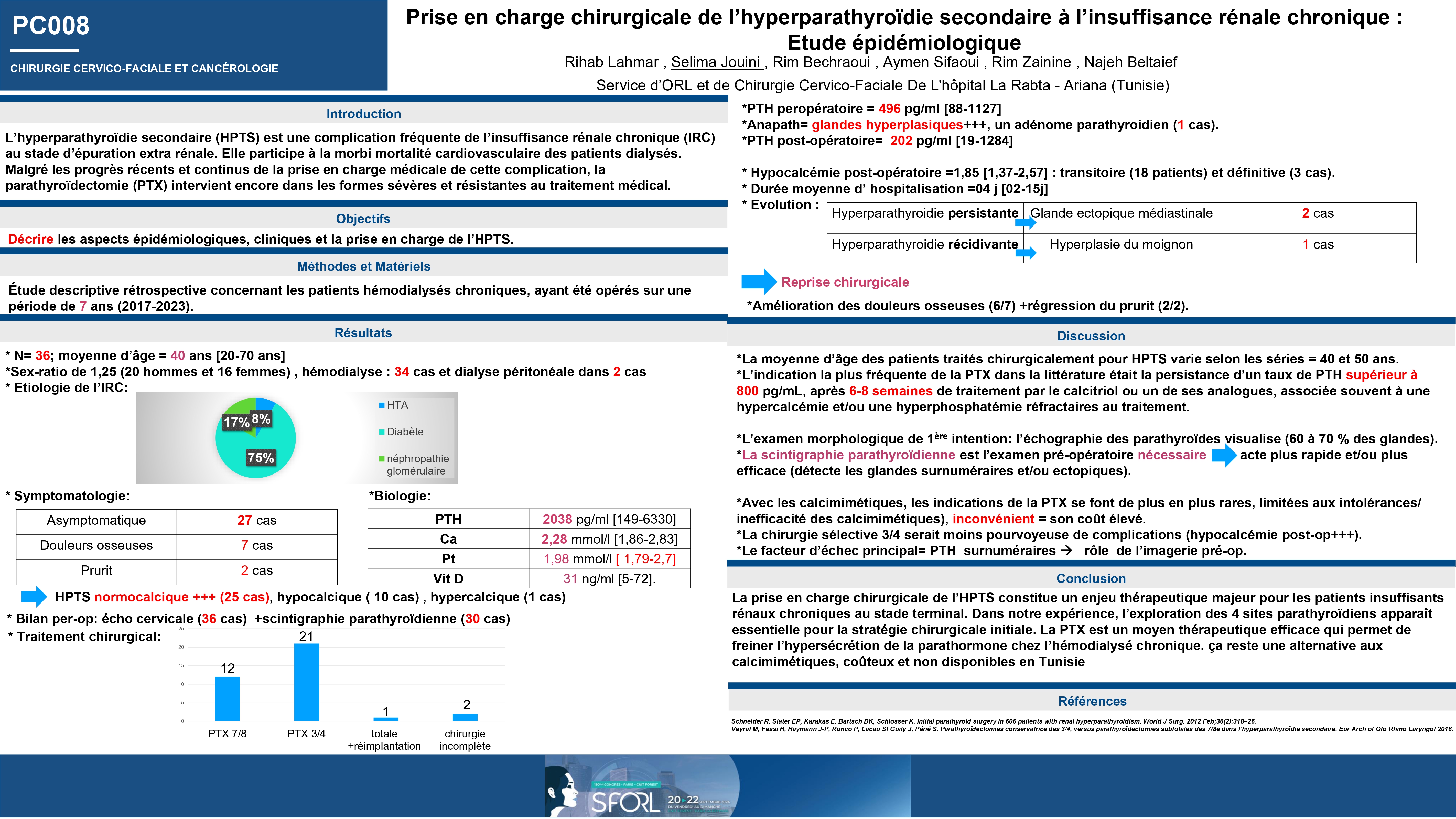 | PC008 – Prise en charge chirurgicale de l’hyperparathyroïdie secondaire à l’insuffisance rénale chronique : Etude épidémiologique | Chirurgie cervico-faciale et Cancérologie | chirurgie-cervico-faciale-et-cancerologie | |
