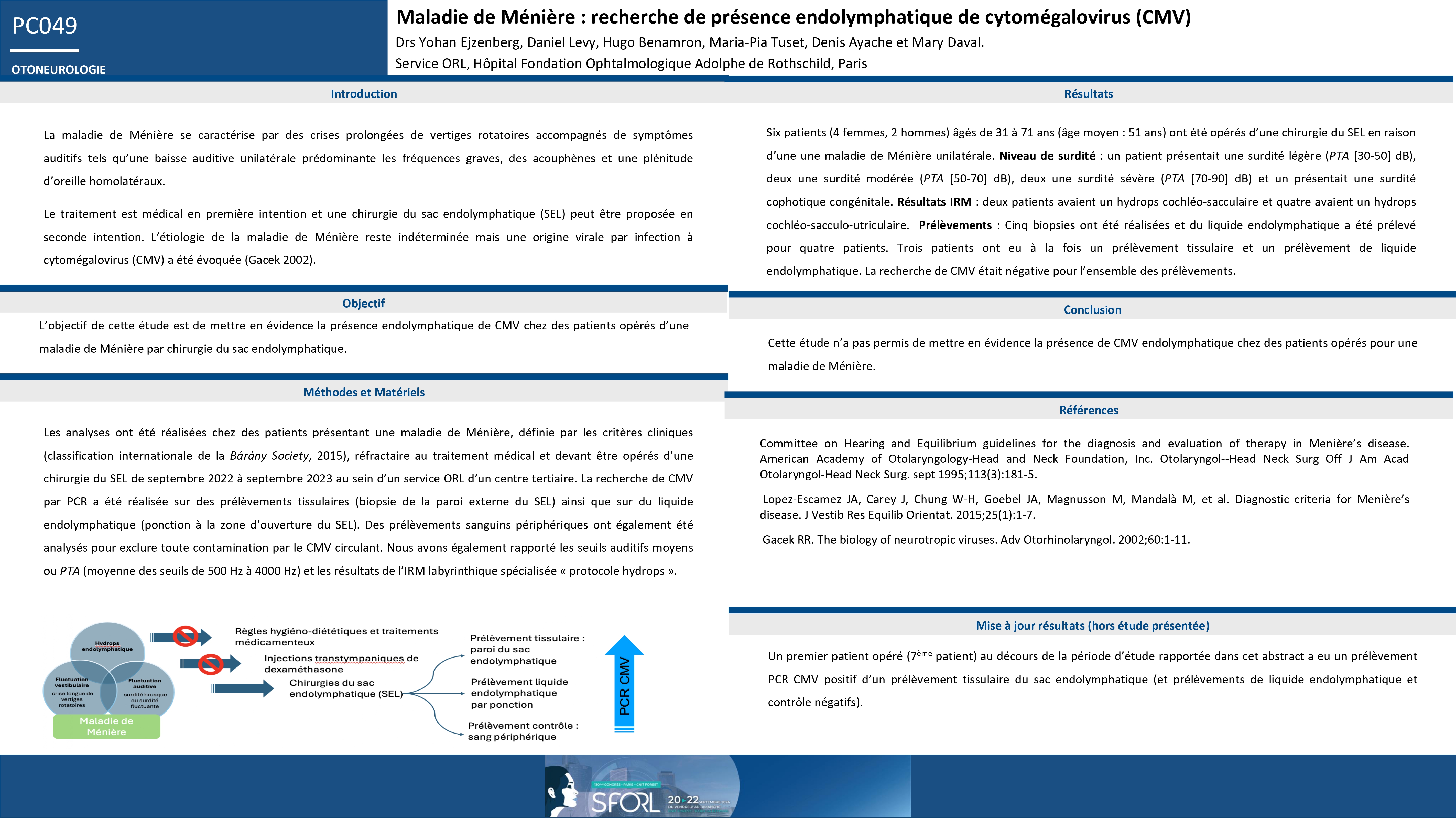 | PC049 – Maladie de Ménière : recherche de présence endolymphatique de cytomégalovirus (CMV) | Otologie | otologie | |
