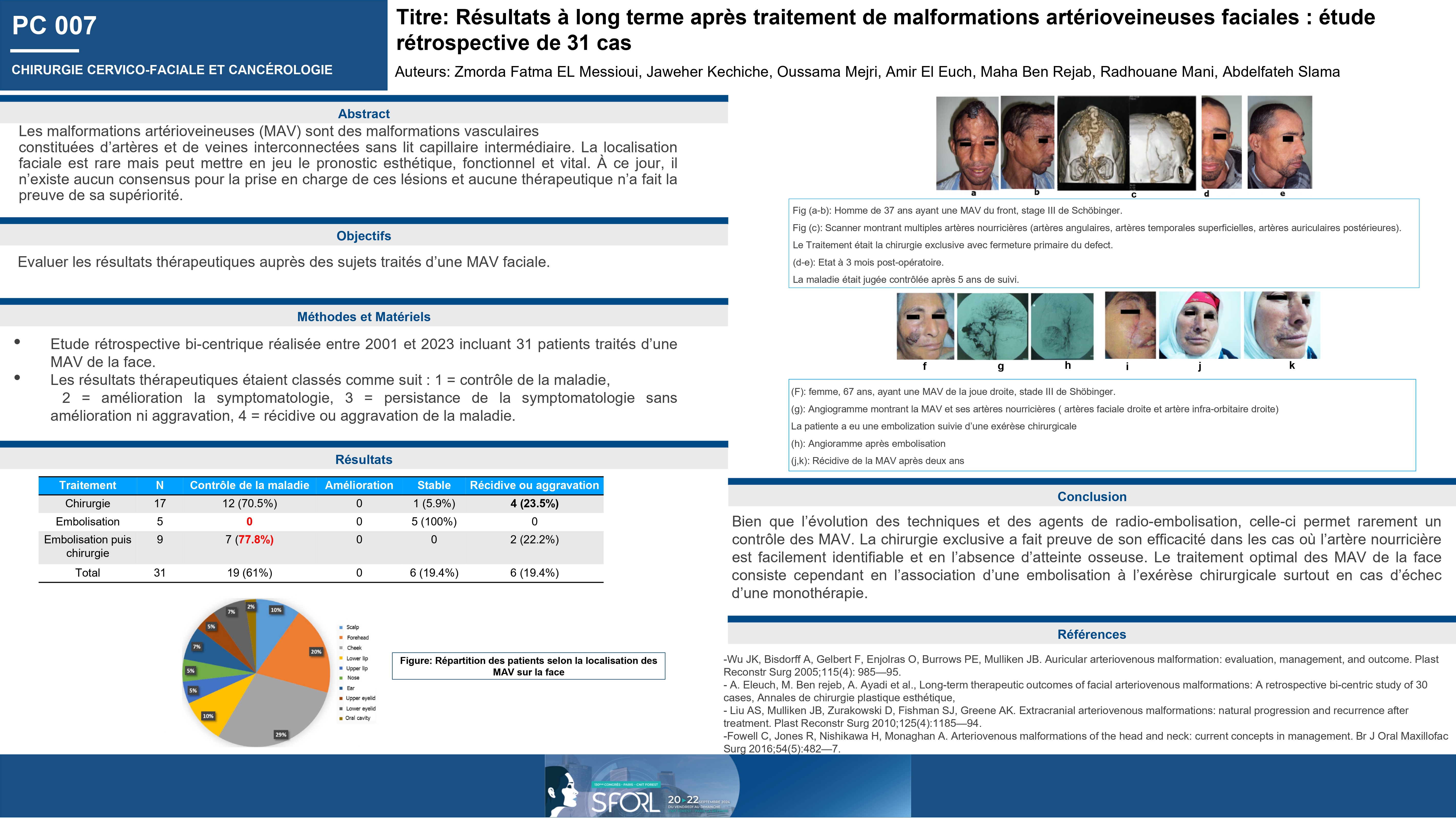 | PC007 – Résultats à long terme après traitement de malformations artérioveineuses faciales : étude rétrospective de 31 cas | Chirurgie cervico-faciale et Cancérologie | chirurgie-cervico-faciale-et-cancerologie | |
