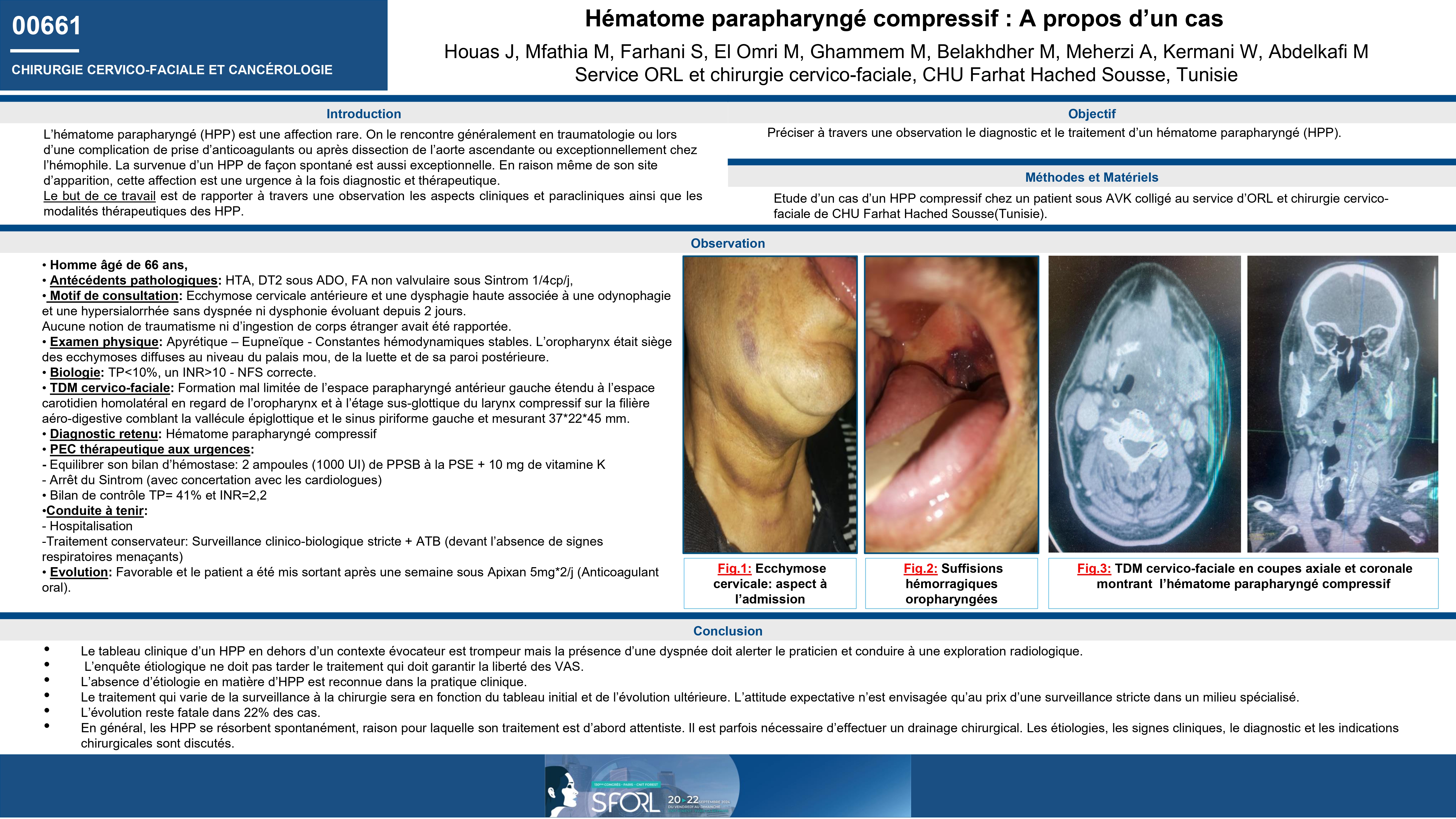 | PC009 – Hématome parapharyngé compressif : A propos d’un cas | Chirurgie cervico-faciale et Cancérologie | chirurgie-cervico-faciale-et-cancerologie | |