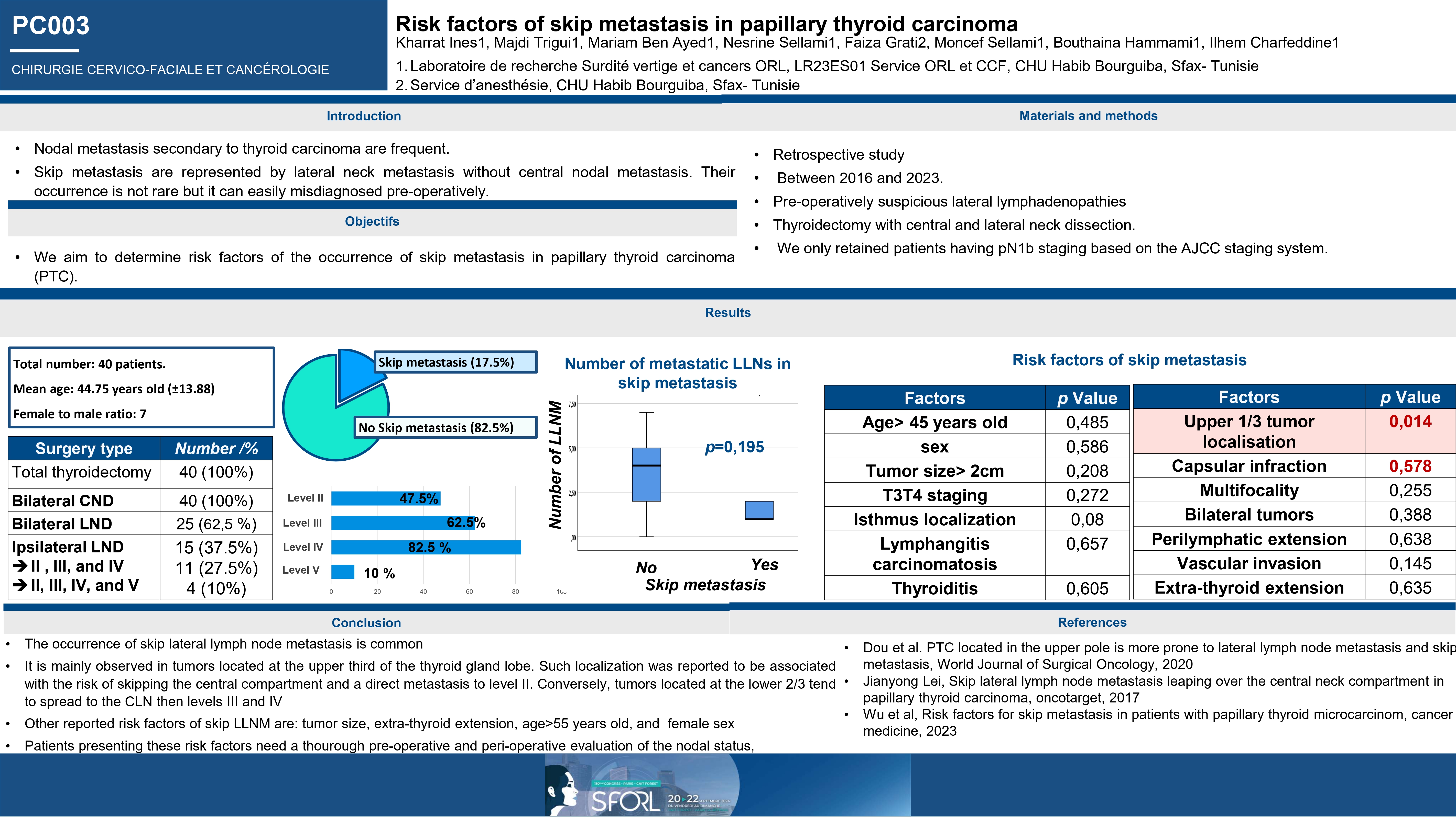 | PC003 – Risk factors of skip metastasis in papillary thyroid carcinoma | Chirurgie cervico-faciale et Cancérologie | chirurgie-cervico-faciale-et-cancerologie | |