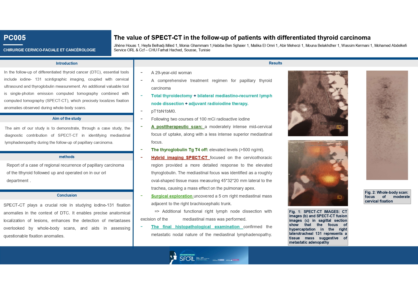| PC005 – The value of SPECT-CT in the follow-up of patients with differentiated thyroid carcinoma | Chirurgie cervico-faciale et Cancérologie | chirurgie-cervico-faciale-et-cancerologie | |