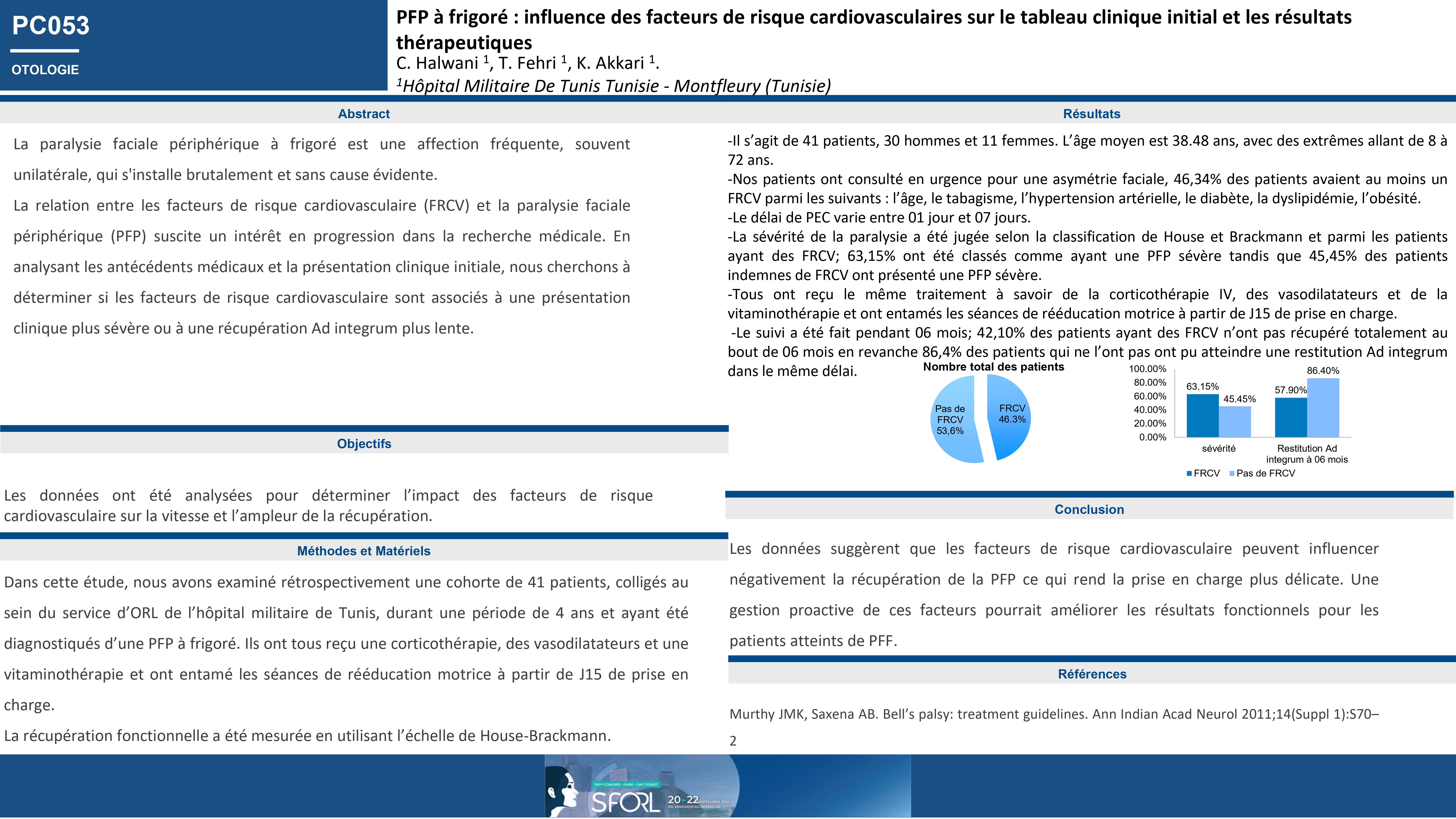 | PC053 – PFP à frigoré : influence des facteurs de risque cardiovasculaires sur le tableau clinique initial et les résultats thérapeutiques | Otologie | otologie | |