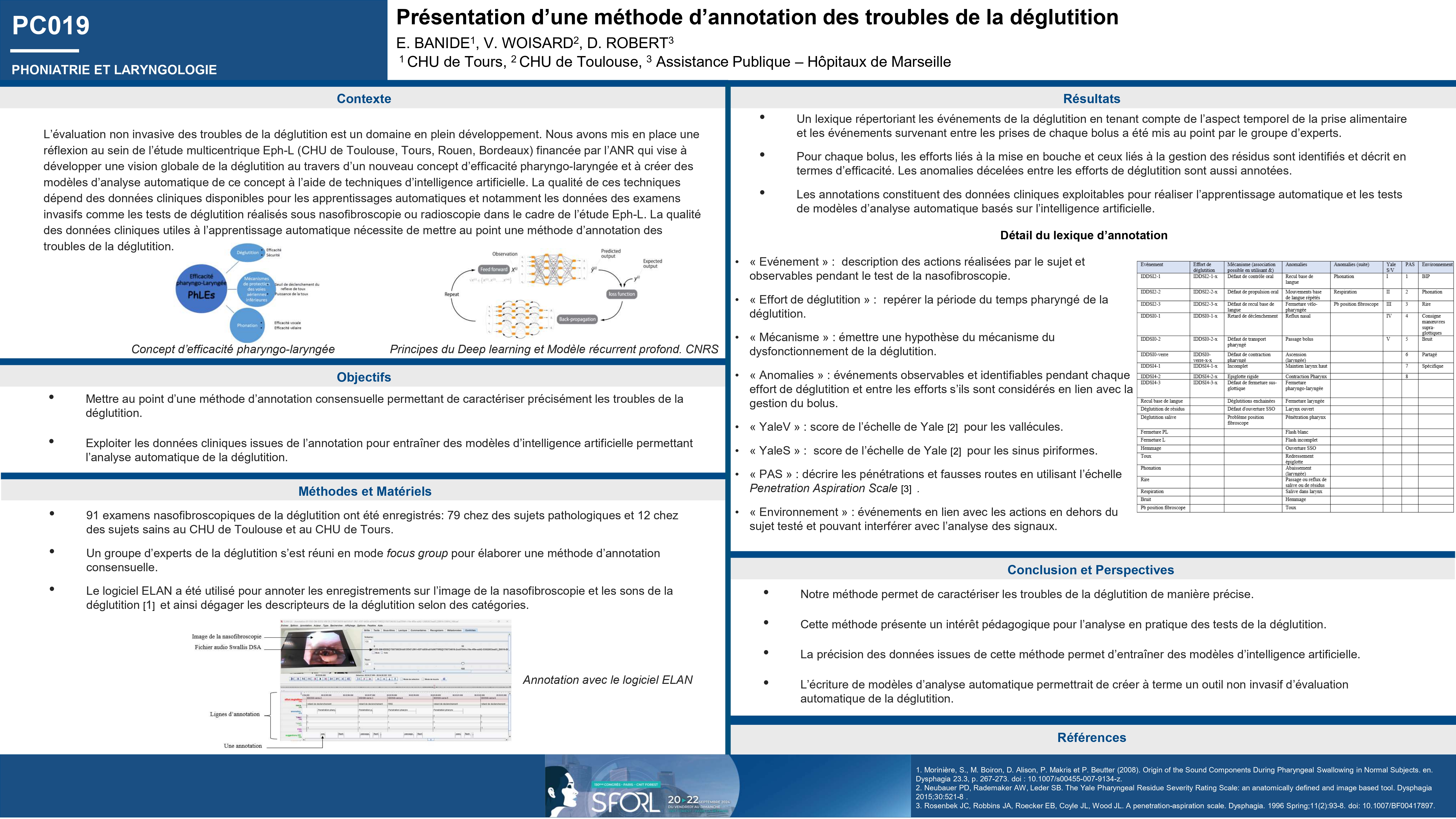 | PC019 – Présentation d’une méthode d’annotation des troubles de la déglutition | Laryngologie et Phoniatrie | laryngologie-et-phoniatrie | |