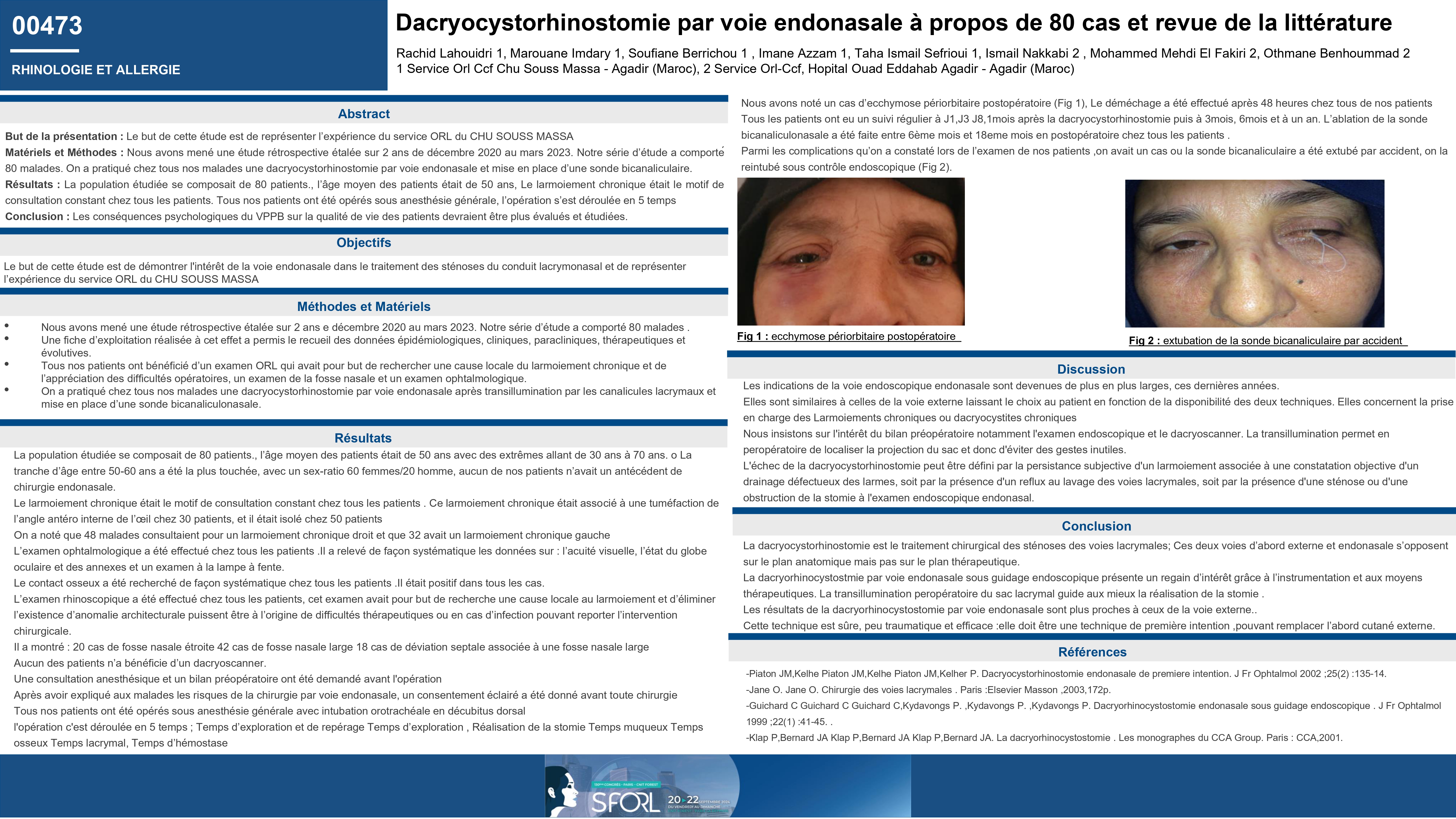 | PC044 – Dacryocystorhinostomie par voie endonasale à propos de 80 cas et revue de la littérature | Rhinologie et Allergie | rhinologie-et-allergie | |