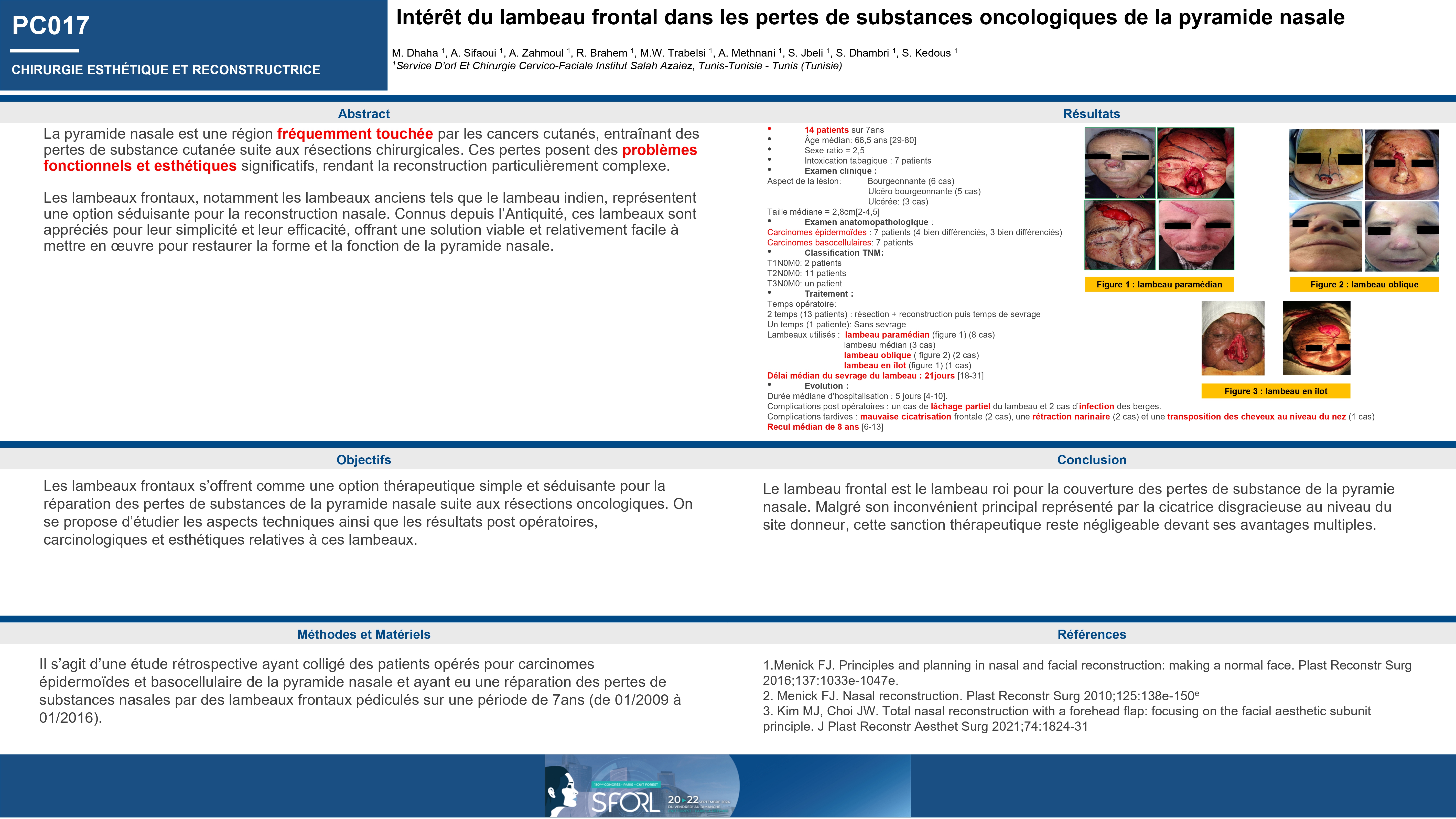 | PC017 – Intérêt du lambeau frontal dans les pertes de substances oncologiques de la pyramide nasale | Chirurgie esthétique et reconstructrice | chirurgie-esthetique-et-reconstructrice | |